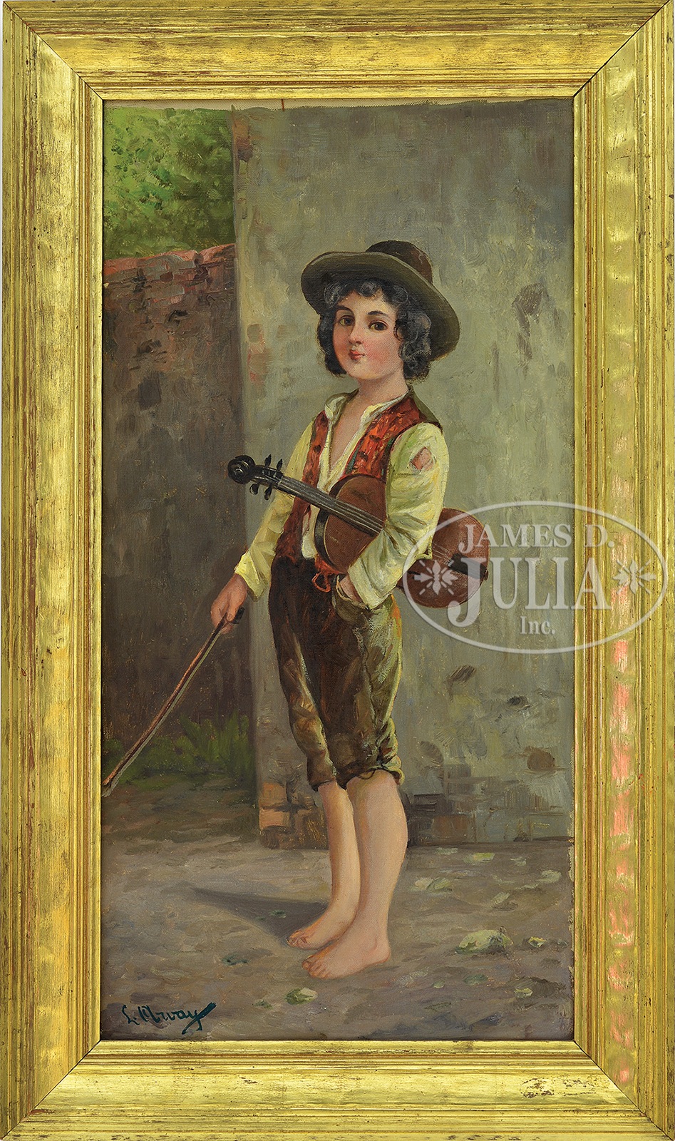 ITALIAN SCHOOL (19th century) TWO GENRE SCENES OF BOYS.Two oils on canvas Housed in matching period gilt frames 1) Boy with violin: signed lower left “L. (?) Rvay” 2) Boy smoking: signed lower right “Giuelt” (?) SIZE: Both paintings: 24″ x 12″. Overall: 28-1/2″ x 16-3/4″ CONDITION: 1) Signature fluoresces; 2) Minor touch up along edges 9-96443 (800-1,200) – Lot 1296