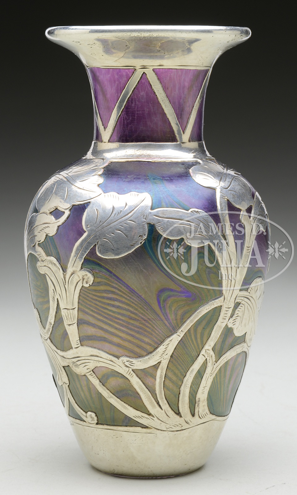LOETZ SILVER OVERLAY VASE.Loetz vase has a green and blue iridescent pulled feather design ascending from the foot against a lilac mottled translucent lightly iridescent background. Vase is further decorated with silver overlay flowers, stems and leaves with a silver overlay zigzag pattern at the neck and silver overlay lip. Silver is marked “999/1000 Fine”. SIZE: 6-1/2″ t. CONDITION: Very good to excellent. 49048-5 (1,000-1,500) – Lot 1296