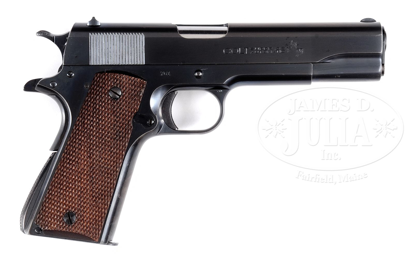 Please Note: Correct terminology is of course “Military” not “Government”. *EARLY PRODUCTION COLT 1911-A1 GOVERNMENT MODEL PISTOL CALIBER 38 SUPER IN AN ORIGINAL COLT MAROON BOX. WITH INSTRUCTION SHEET AND WRAPPING PAPER.SN 761. Cal. .38 SUPER. 5″ bbl, blue finish, checkered walnut grips. A very early example of a Colt 38 Super pistol in an orig Colt box. SN 761 clearly marked on frame and rear of slide. “S” inspector mark on inside top flat of frame in front of hammer. Colt inspector # 1 on left front trigger guard bow and assembler # 20 on right front of trigger guard bow. Two-tone magazine with “.38 Auto Colt” on end plate. All other features are standard as made by Colt. Box is maroon in color with minor loss on lid. Good end label marked “Super .38”. #761 is barely visible written in pencil on bottom of box. Box contains Colt instruction sheet and wrapping paper. Lid has Colt advertisement in English and Spanish. CONDITION: Very fine. Slide retains 95% mirror polish blue with slight muzzle wear on left side and slight high point wear on right side of muzzle, on front sight, and on rear sight. Some very light scratch marks are evident. Bore is bright with strong rifling. Frame retains 98% mirror blue finish with slight high point wear at front end and a very slight scratch on left side below takedown pin. Hammer and trigger retain 90% bright blue with slight scratch marks. Walnut grips are very fine with very sharp checkering and only one slight impression dent on right grip. Magazine is fine with a clear temper mark and some loss of finish on bottom plate. A very fine example of a Colt 1911 A-1 .38 Super pistol in an orig Colt box. Extremely difficult to improve upon. 49616-19 TEP C&R (6,000-8,000) – Lot 1296