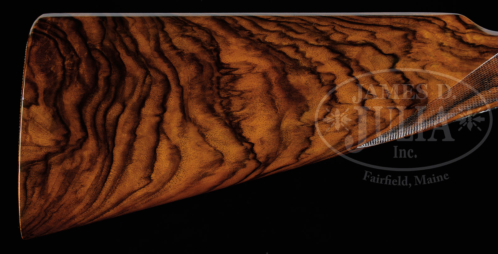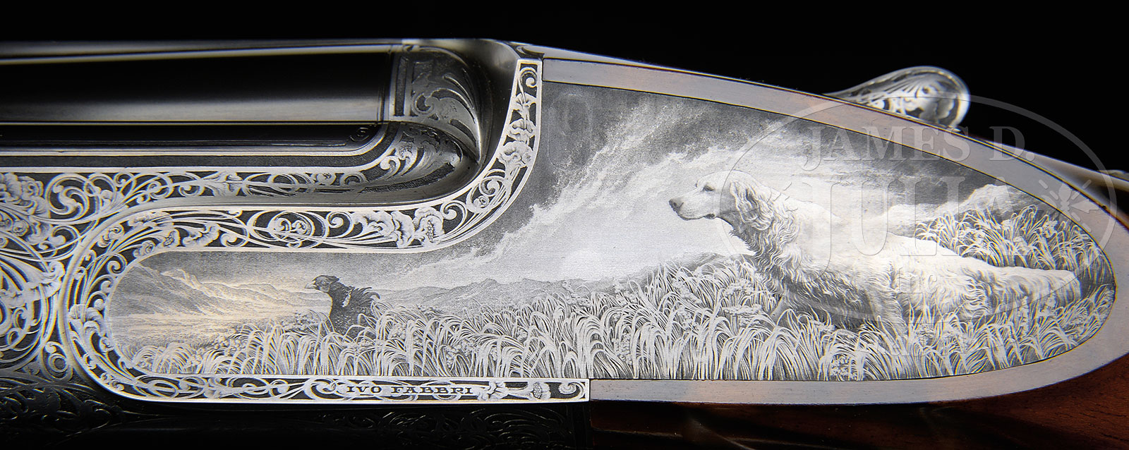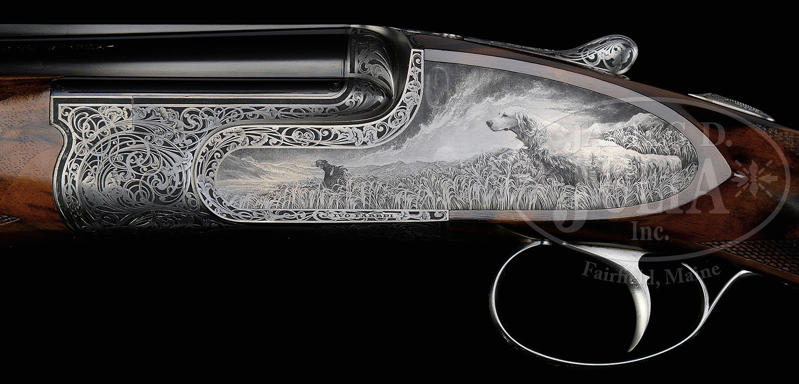 *STUNNING PAIR OF IVO FABBRI 20 GA OVER-UNDER GAME SHOTGUNS WITH INCREDIBLY DETAILED POINTER, SETTER, AND PHEASANT SCENES BY RENOWN MASTER BULINO ENGRAVER, FIRMO FRACASSI, AND “BEST” SCROLL BY VALERIO PELI, WITH CASE AND EXTRA STOCKS.SN 3544/3545. (1994) Cal. 20 ga. 3″ Chambers. Superbly struck 28″ demi-bloc bbls mounted with relatively broad concave solid ribs, are engraved “IVO FABBRI – BRESCIA – ” “VACUUM ARC REMELTING STEEL” on top bbls either sides of ribs. Guns are built as a true pair with nos “1” and “2” gold inlaid on rear portions of ribs, top straps, and forend tips. Flats on bottom bbls are stamped with 1994 Italian nitro proofs for 3″ chambers. Coin finished actions with non-automatic safeties (SICURA gold inlaid), and single non-selective triggers are fitted with Fabbri’s well re-engineered pinless sidelocks. Actions are engraved with near full coverage superbly executed large flowing open scroll with acanthus and floral highlights having exceptionally well done shaded backgrounds, in a unique creation by Valerio Peli of Creative Arts, whose signature appears on right sides of trigger plates. This dramatic scroll surrounds portraits of English Pointer and Gordon Setter in different poses on the bottom of each gun. Sides of actions have vignettes extending to the edges of sideplates with one gun depicting the Setter, and the other the Pointer. On the left lock of gun “1” the pointer is alert with cock pheasant ready to spring from wheat stubble. The background is of realistic dark woodland bisected by meadow. On the right lock a pheasant is taking wing while pointer springs in pursuit. Gun “2” depicts similar scenario with scenes repeated with major subject being the Gordon Setter. The background is different as it is mountainous with very dramatic clouded sky and sunset. These scenes are the epitome of the engraver’s art, and one can almost feel the texture of the dogs coats. Examination with a 10X glass reveals the delicacy of the graver cuts needed to achieve this effect. This astonishing work is by acknowledged Italian master engraver Firmo Fracassi, whose signature, and work numbers (INCISO DA FRACASSI PER LAMICO PERO XXXI (and XXXII) with an “R” in circle. are on the left sides of trigger plates. (Firmo Fracassi started numbering the guns he had engraved around 1979.). Mr. Peli’s scroll extends onto small bow trigger guards which have SNs in gold on tangs. Exhibition quality honey toned, darkly marbled European walnut straight grip buttstocks measure 14-7/8″ over checkered wood butts. Exceptionally well cut point pattern borderless checkering is at grips. Guns are accompanied by a second pair of stocks and forends with shorter LOPs (about 5/8″ less) which are the orig stocks supplied with the guns, and are of very fine intricately marbled European walnut with fiddle figure. Matching slim ejector forends have Anson type releases. Orig forends match orig stocks very well. Gun “1”: Bore diameter: top -.628, bottom – .628. Bore restrictions: top – .017 (mod), bottom – .006 (IC). Wall thickness: top – .023, bottom – .023. Drop at heel: 2-3/8″, drop at comb: 1-1/2″. Cast 5/8″ off. Weight: 6 lbs. 4 oz. LOP: 14-7/8″. Gun “2”: Bore diameter: top -.628, bottom – .627. Bore restrictions: top – .016 (mod), bottom – .003 (IC). Wall thickness: top – .023, bottom – .025. Drop at heel: 2-1/4″, drop at comb: 1-1/2″. Cast 5/8″ off. Weight: 6 lbs. 4 oz. LOP: 14-7/8″. Orig leather case with stitched leather corners by Nizzoli contains the orig stocks. (Partitions must be removed for present stocks to fit.) This case is lined in burgundy cloth and has paper Fabbri label in lid. Case contains a Star turnscrew and case straps. PROVENANCE: Originally made for noted Italian Super-collector Luigi Peppini, these guns were given 8 pages of superb photographs in a private folio of his superb collection which also accompanies this lot. These photographs show the guns “wearing” their orig stocks. These guns are fully illustrated in FIRMO & FRANCESCA FRACASSI-MASTER ENGRAVERS by Elena Micheli and Stephen Lamboy. This pair is also featured in the classic tome IL GRANDE LIBRO DELLE INCISIONI by Marco Nobili. CONDITION: Excellent, retaining essentially all orig finishes on wood and metal with only the slightest handling and assembly marks. Guns appear unfired since proof. Mechanically crisp. Fabbri case is excellent. Simply an irreplaceable pair of guns. Work of this intricacy will most likely not be available in the future. Often engraving of this caliber takes 1000+ hours to complete. Fracassi engraves an average of two guns a year for obvious reasons. 51718-1 MGM130 (375,000-575,000) – Lot 1296
