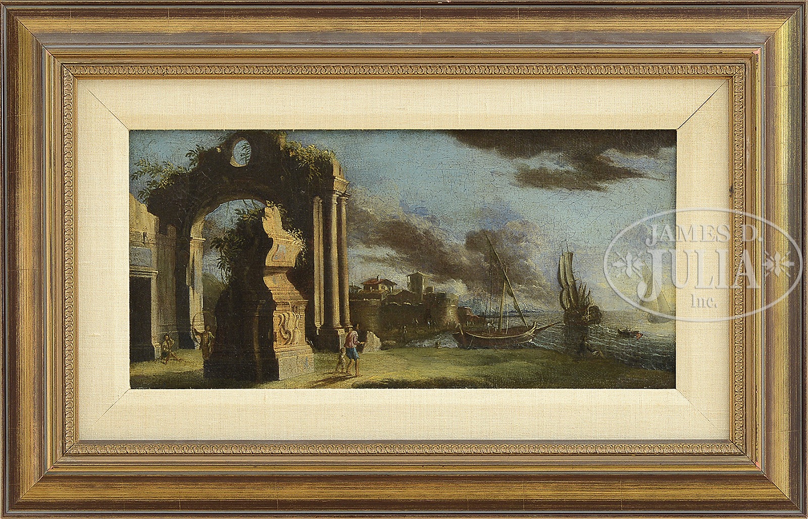CIRCLE OF LEONARDO COCCORANTE (Italian, 1680-1750) FIGURES IN A COASTAL LANDSCAPE WITH ARCH.Oil on canvas/hemp Housed in a contemporary frame with linen liner Unsigned, bears “Wilhlem Knoch, Dortmund” label affixed to verso canvas with typed inscription “Abbatini, Guido Ubaldo, 1600-1656″ SIZE: 7″ x 14-1/2”. Overall:13″ x 20-1/2″ CONDITION: Overall good, with craquelure and reinforced canvas. Minor touch up. 49991-2 (1,000-2,000) – Lot 1297