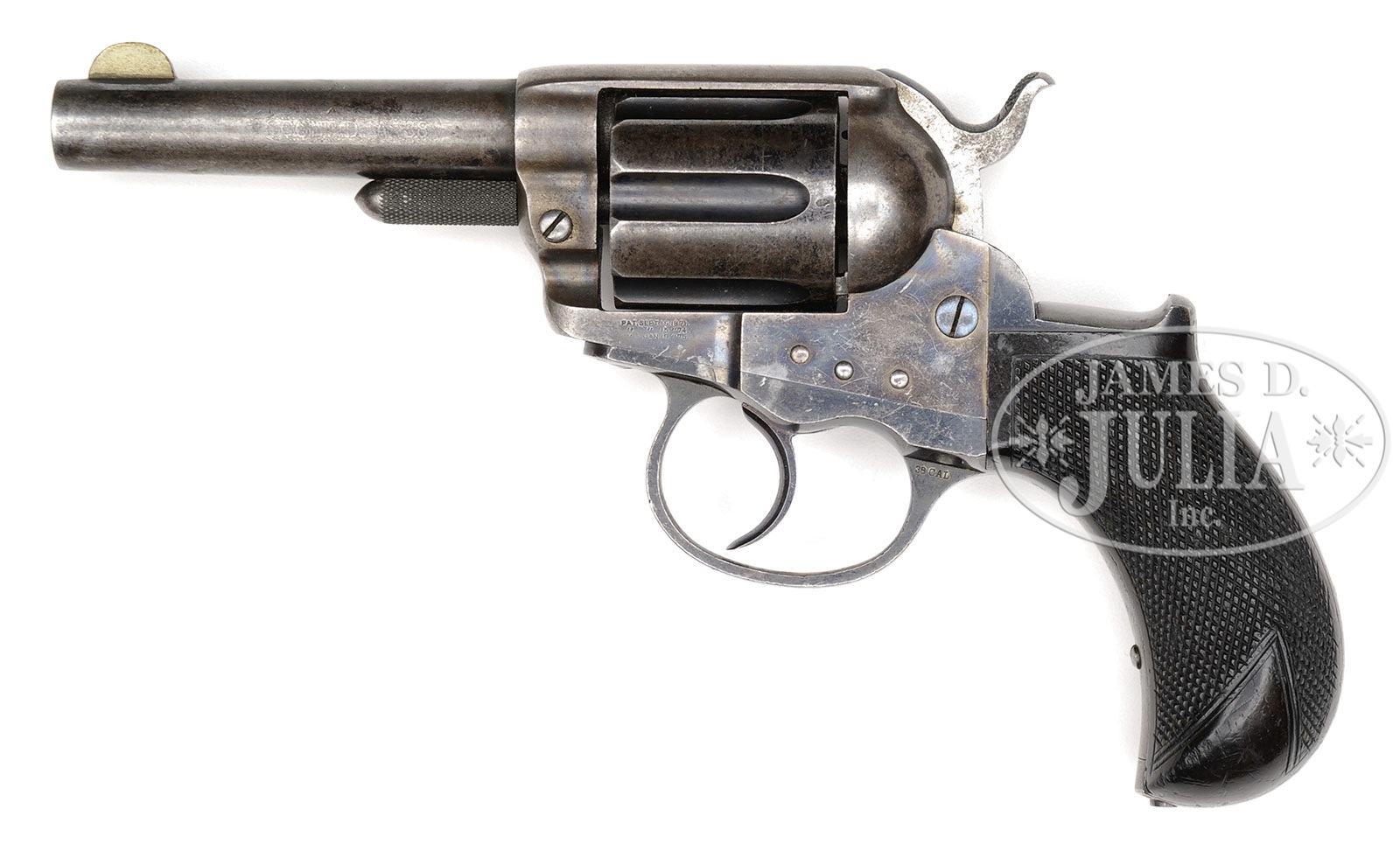 Has the rarer London address, not the common Hartford address, this is much more rare. COLT MODEL 1877 LIGHTNING SHERIFF’S MODEL DA REVOLVER.SN 16523. Cal. 38 Colt. Blue & color case hardened with 3-1/2″ bbl without ejector, German silver front sight and 2-line address with “COLT D.A. 38” etched panel on left side. Left side of frame has 3-line patent dates and left rear web of trigger guard is marked “38 CAL”. Bottom of bbl & cyl have tiny British proofs. Mounted with checkered, 1-pc, rosewood grip. The model 1877 was Colt’s first double action revolver and saw widespread use, especially in the U.S,. and blued examples with any orig finish are quite scarce. PROVENANCE: Tommy Rholes Estate Collection. CONDITION: Very good. Bbl retains about 20% orig blue with the loss areas a medium patina; frame retains bright case colors on the sides, fading on the recoil shield, loading gate & top strap; trigger guard & backstrap retain strong orig blue in sheltered areas, thinning elsewhere; cyl retains plummy blue in the flutes and a blue/brown patina on the outer diameter. Grip is sound with a few chipped diamonds and sharp edge wear and retains about 75% orig varnish. Mechanics are fine; very bright shiny bore. 4-50512 JR402 (1,500-2,000) – Lot 1298