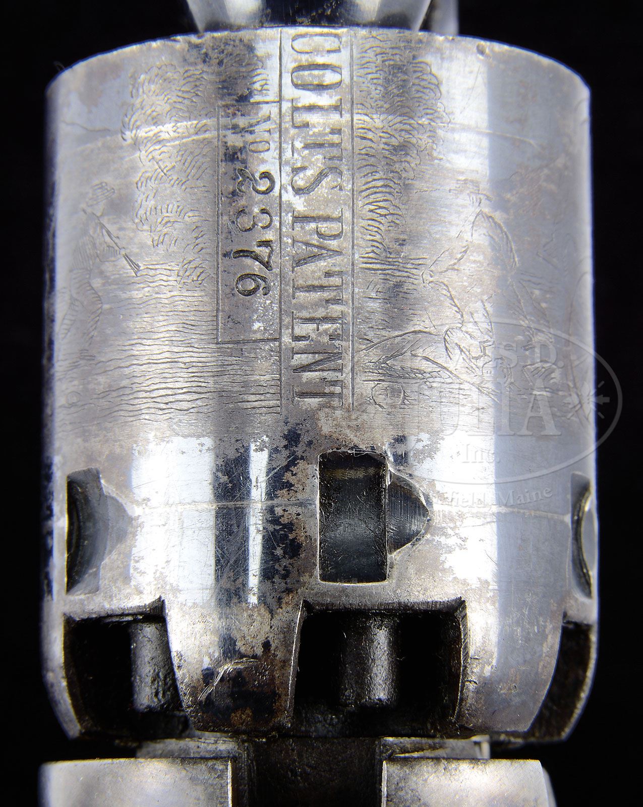 EXTREMELY RARE CASED CHARTER OAK COLT MODEL 1849 POCKET PERCUSSION REVOLVER.SN 312376. Cal. .31. Blue & color case hardened with 5″ octagon bbl that has brass pin front sight & 1-line New-York U.S. America address. Left side of frame is without the “COLTS PATENT” marking or caliber marking on left shoulder of trigger guard. Cylinder has six chambers with the stagecoach holdup scene roll marking. The large guard silver-plated brass trigger guard & backstrap contain an extremely rare “Charter Oak” 1-pc oak grip with last 4 digits of matching SN in backstrap channel. Accompanied by an orig blue velvet lined mahogany casing that is compartmented in the bottom for the revolver, a single-sided “COLTS PATENT” eagle and stars flask, a high polish blue “COLT’S PATENT” bullet & ball mold with sprue cutter, marked on right side “31 PKT”. Left arm of mold is bent. Also accompanied by an L-shaped nipple wrench and a functioning key. This revolver almost certainly was intended as a presentation with its extra polish blue on the bbl and bullet mold along with the grip from the famed “Charter Oak”. The Charter Oak was a very historic tree that played an instrumental part in the founding of the State of Connecticut. Prior to the Revolutionary War, on the night of a State Charter meeting, the British sent troops to confiscate the new Connecticut charter. However, patriots learned of the forthcoming raid and after the British arrived the lights were mysteriously extinguished and when they were re-lit the charter had disappeared. One of the committee members spirited the constitution out of town and hid it in the large hollow of the venerable old oak, saving the charter. Thereafter the tree was referred to as the “Charter Oak”. In 1856 this old tree was destroyed in a wind storm and at the time it was estimated to have been 800-1,000 years old. Local Indians venerated the old tree. Numerous souvenir articles were produced from the wood and sold but Samuel Colt obtained enough of the wood to produce a number of special grips for his presentation firearms, this being one of them. R.L. Wilson, in his “Colt Engraving Book”, pg 100 displays a presentation Colt 1849 Pocket SN 110003, and describes it as being the “only Charter Oak Model 1849 pocket revolver known to the author”. The gun presented here was unknown to the author as it has been in a private collection for the past 30 years. This extremely rare example is therefore one of two known and undoubtedly the last Charter Oak Model 1849 ever made. CONDITION: Very fine plus, all matching including cyl & grip, except wedge which is properly unnumbered. Bbl retains about 95-96% glossy high polish blue with muzzle & sharp edge wear, a couple of small scratches and several nicks & dings around the wedge slot; rammer handle retains brilliant case colors; frame & hammer retain most of their orig case colors, extremely bright on sides of frame, lightly faded on recoil shields; hammer retains extremely bright case colors on sides & rear edge with top edge faded to silver; trigger guard retains 80-85% strong orig silver and back strap 30-40% silver with the exposed brass a medium mustard patina; cyl retains 30-40% orig blue, showing about 95% stagecoach holdup scene; grip is sound showing wear on left edge and a few minor chips in the finish and overall retains about 90% strong orig varnish. Mechanics are fine; strong bright bore with moderate pitting. Case has a grain check in bottom with one loose bottom front corner, otherwise is completely sound with light storage & handling marks and retains about all of its bright orig varnish with bright polish on the lock escutcheon; interior is lightly faded & soiled with wear from the front sight & hammer spur and one re-glued partition; flask appears new and retains 96-97% orig finish with minor wear on collar and bright blue on spring with minor dulling on back side; mold retains 70-80% bright high polish blue with numerous nicks, dings & scratches and a bent left arm, with crisp clean cavities; nipple wrench is near new. This is a truly rare opportunity to purchase a Charter Oak Colt. 4-48066 JR222 (35,000-45,000) – Lot 1298