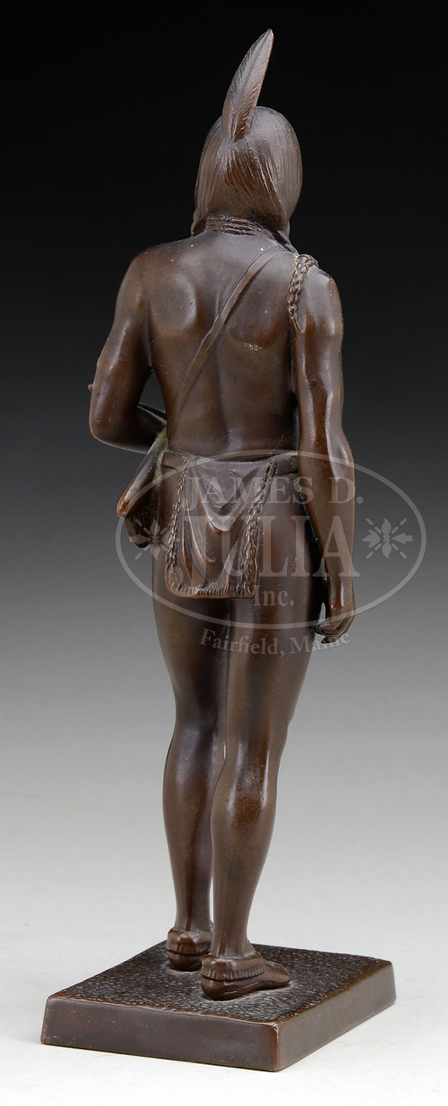 CYRUS DALLIN (American/French, 1861-1944) “MASSASOIT”.Bronze Signed “Dallin” on side of base and titled at front of base NOTE: The large bronze of Massasoit (1920) is opposite Plymouth Rock, Plymouth, MA SIZE: 11-1/2″ h CONDITION: Nice brown patina, arm with pipe has three dings at elbow, otherwise very good 52003-8 (4,000-6,000) – Lot 1298