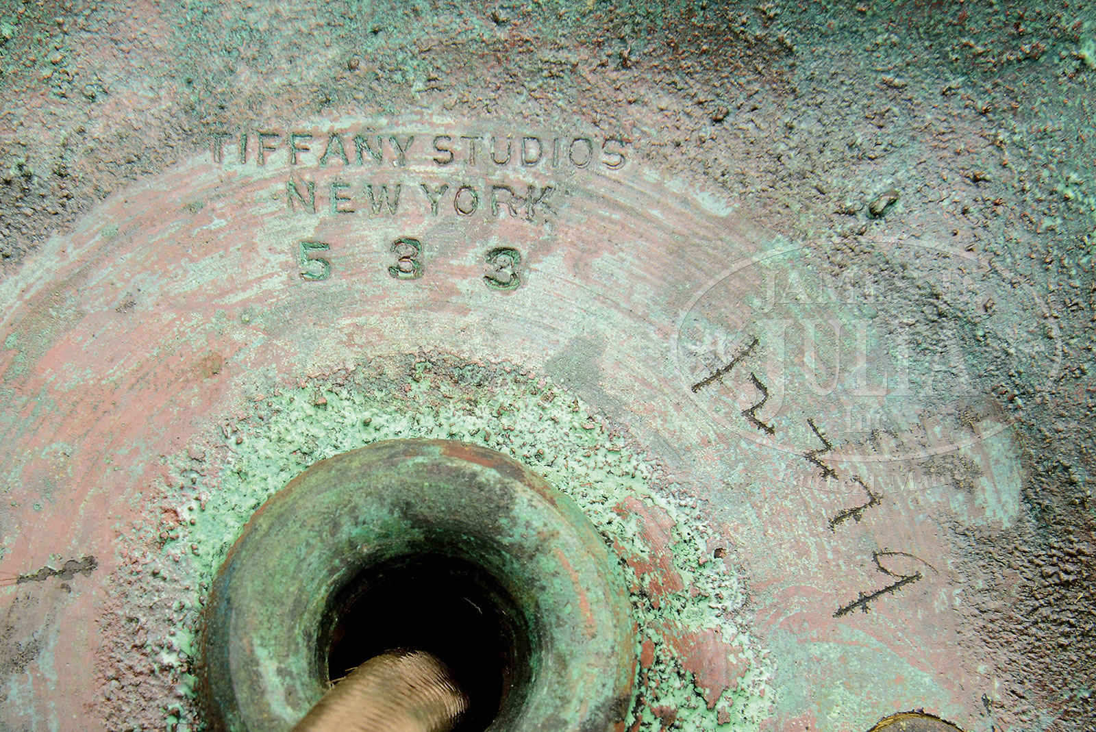 Please Note: The shade has old professional restoration to reinforce the leading. TIFFANY STUDIOS LINENFOLD TABLE LAMP.Tiffany Studios table lamp has bronze stick base with simple shaft leading to a 3-socket cluster. The base is finished with rich brown patina and subtle green highlights and is signed on the underside “Tiffany Studios New York 533”. The base supports a Tiffany Studios shade with ten amber linenfold panels and linenfold trim pieces at top and bottom. The bronze frame of the shade is finished in a rich reddish-brown patina. Shade is signed on the inside rim “Tiffany Studios New York 1947 PAT. APPL’D FOR”. Lamp is complete with linenfold heat cap. SIZE: Shade 16-1/2″ dia. Lamp 23″ t. PROVENANCE: From the Unreserved Estate of Lynda Cunningham. CONDITION: Base is very good to excellent. Shade has several small flakes, chips and tight hairlines to several border tiles, all large linenfold panels are undamaged. Linenfold heat cap has a small corner of glass missing. Rewired with appropriate cloth cord. 51361-162 (5,000-7,000) – Lot 1299