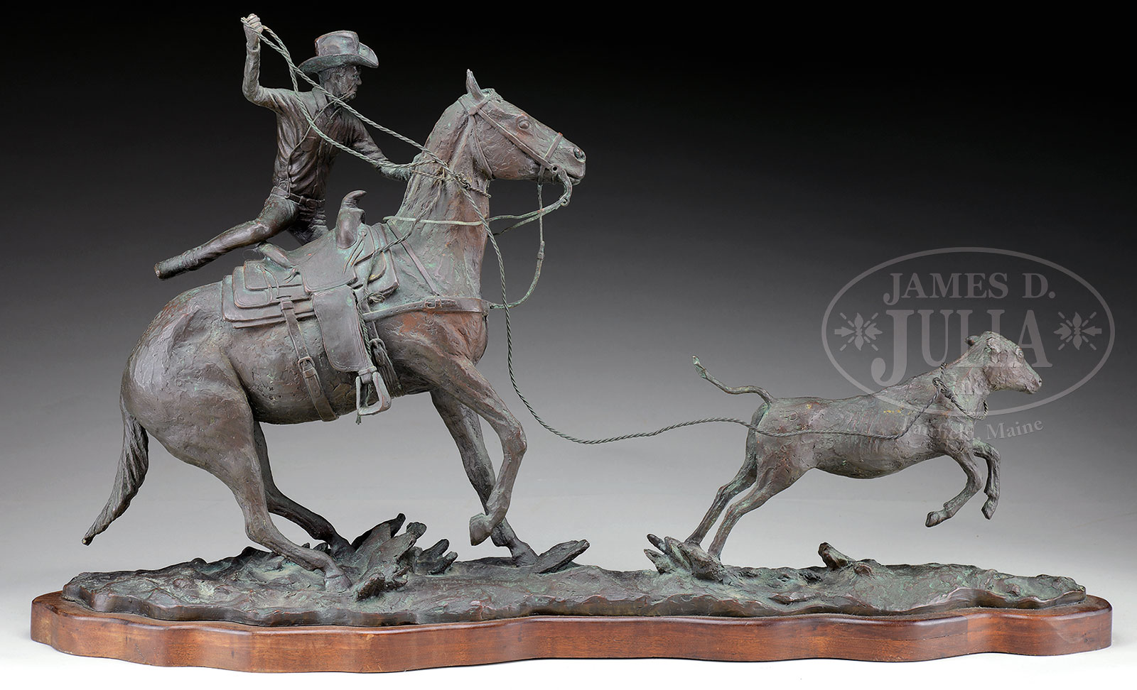 Bronze Mounted to a shaped wood base Signed on base “Truman Bolinger 1973″ SIZE: Bronze: 20-1/2″ h x 35″ l. Overall: 21-3/4″ h x 37” l CONDITION: Very good 52003-6 (4,000-6,000) – Lot 1299