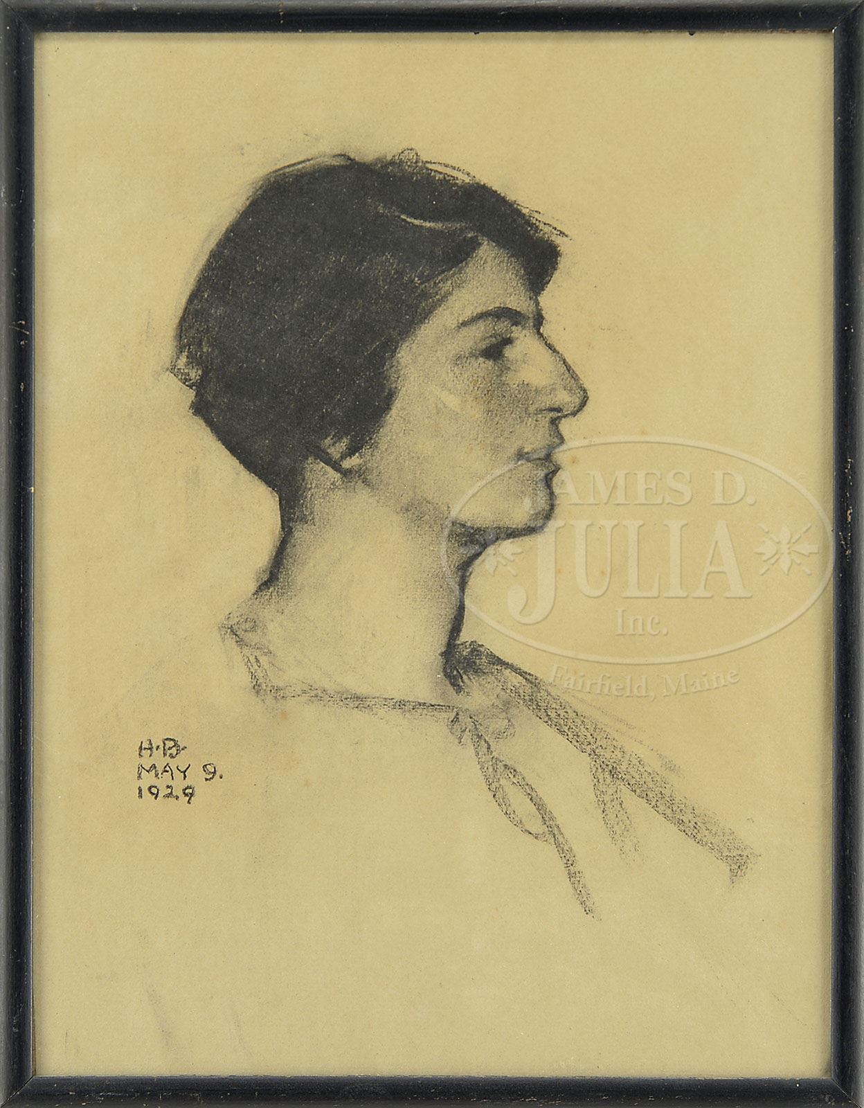 HILDA BELCHER (American, 1881-1963) TWO PORTRAIT WORKS OF ROSA BROOKS. 1) Oil on canvas mounted to cardboard Housed in a simple pine frame Signed lower left “Hilda Belcher” 2) Charcoal Portrait Housed in a simple black frame with glass Signed lower left “HB May 9, 1929″ SIZE: 1) 5″ x 3-1/2″ Overall: 8″ x 6-1-2? 2) Sight: 14-3/4″ x 11″ Overall: 15-1/2″ x 12” CONDITION: 1) Some light scrapes, canvas is cut and mounted to cardboard (not stretcher), otherwise good 2) Very good 9-91727 (1,000-1,500)