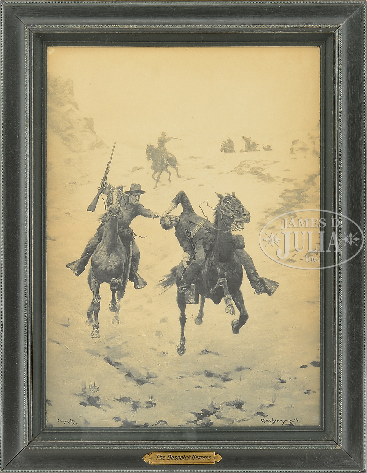 CHARLES (OR CARL) SCHREYVOGEL (American, 1861 – 1912) “DISPATCH BEARERS”.Lithograph Housed in a black frame with shadowbox type glass front Signed in the print “Cha’s Schreyvogel” bottom right, also “Copyright 1900″ bottom left SIZE: Sight: 19″ x 13-3/4″ Overall: 24″ x 18-1/2” CONDITION: Time toned, otherwise very good 9-94504 (1,500-2,500) – Lot 1302