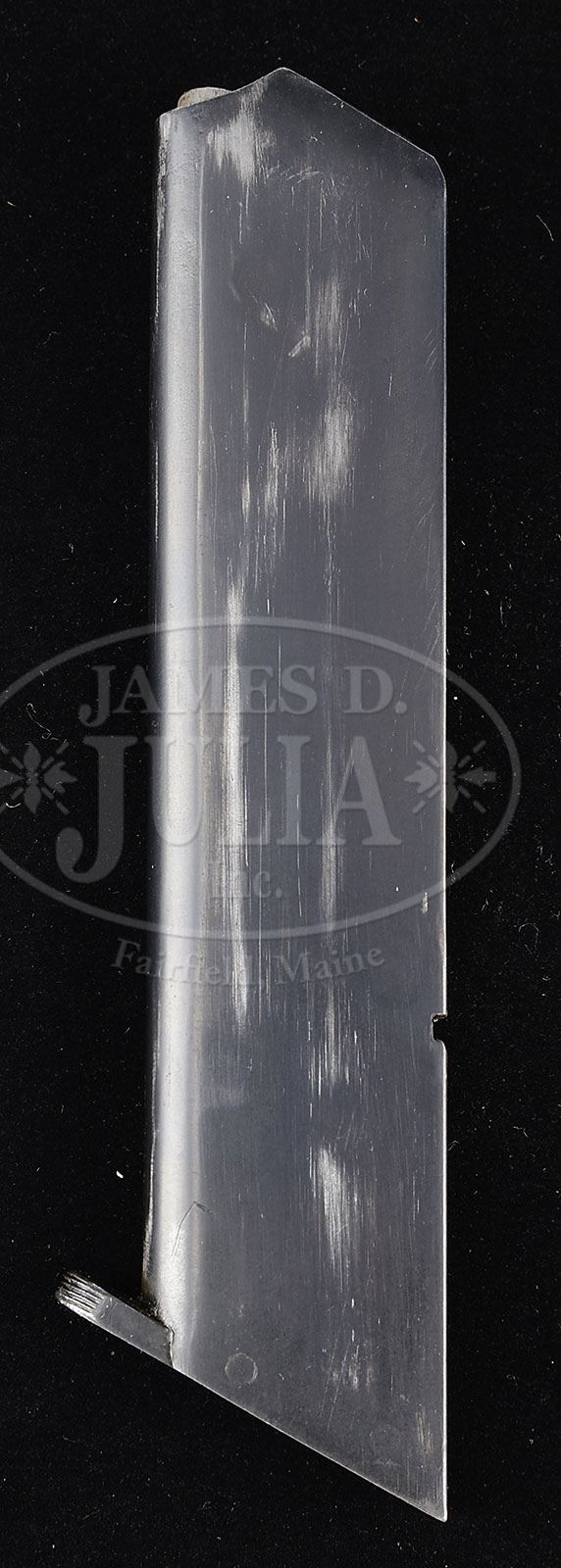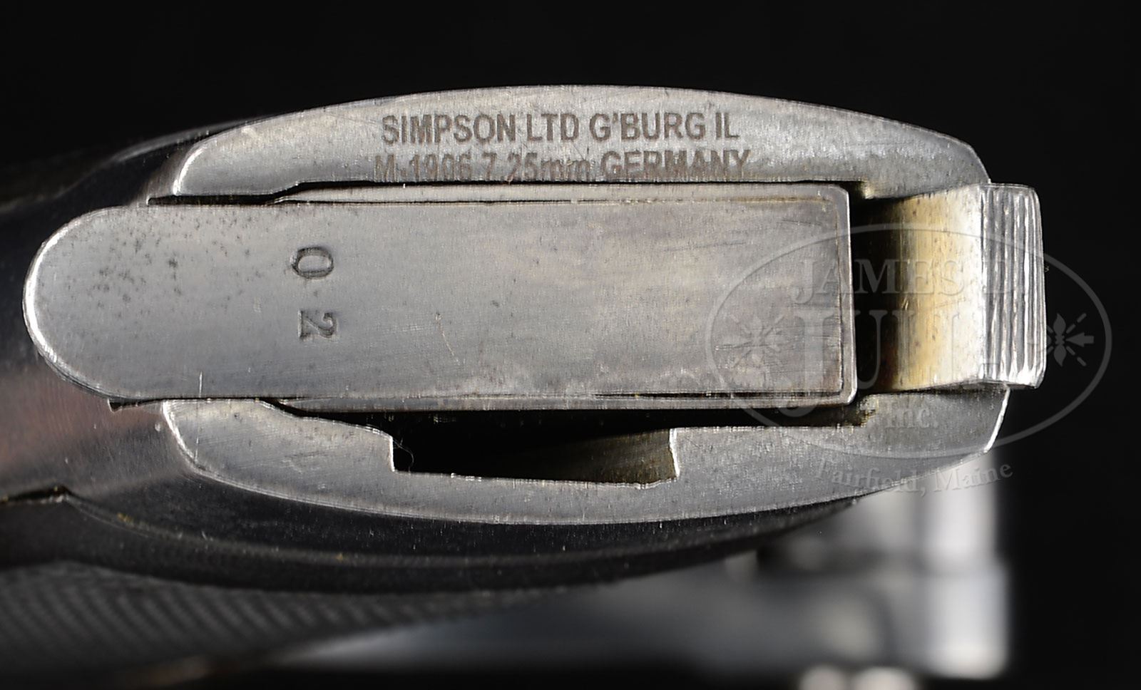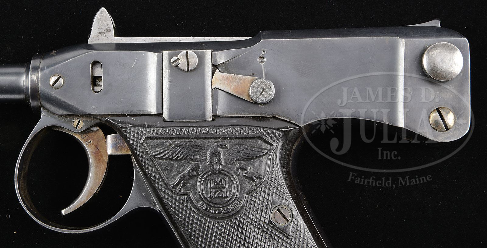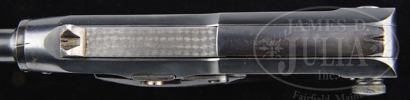 *◊ PHENOMENAL M1906 ADLER PISTOL WITH MATCHING MAGAZINE.SN 1202. Cal. 7.25 mm. Exceptional Adler pistol with 3-1/4″ bbl having a fixed front sight. The fixed rear sight also acts as the charging handle for the top mounted jeweled bolt. The only markings on the left side of the pistol are the “F” & “S” safety detents. On the right side of the receiver is a 3-line legend “PATENT HAEUSSLER / ADLERWAFFENWERKE / ENGELBRECHT & WOLFF” along with a (Zella-Mehlis) Crown/Crown/U proof that appears on the same side of the bbl and bolt. Beautifully polished pistol whose major components are rust blued except for the in-the-white bolt and strawed safety lever, trigger, receiver screws and magazine release. Orig matching rust blued magazine. Beautiful hard rubber grips with deeply embossed logo surrounded by bordered checkering. PROVENANCE: Illustrated TBLAP. Ex Visser collection. Collection of Dr. Geoffrey Sturgess. CONDITION: Bright 98-99% rust blue with negligible sharp edge wear and freckling on front & backstrap. Comparable condition small parts, though slightly more fading on the strawed hammer & safety. Grips are crisp, showing virtually no wear, with the right panel having a barely discernible crack. Mirror bore. Perfect manual mechanics. One of the best Adler pistols in existence. 4-52508 LMA89 (12,500-17,500) – Lot 1302