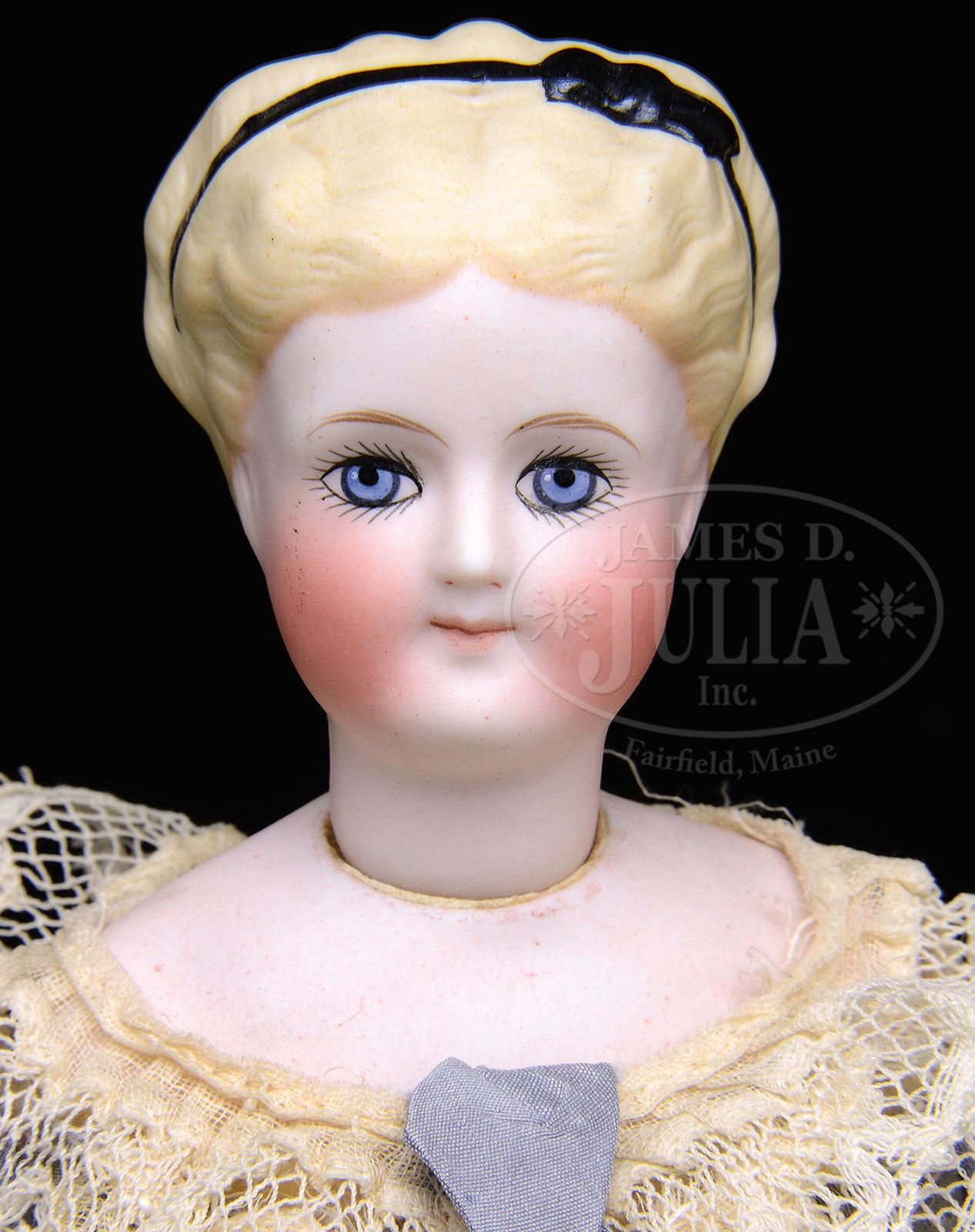 SMALL PARIAN DOLL ATTRIBUTED TO SIMON AND HALBIG.Rare miniature doll with swivel head with molded and painted features which is attached to separate bisque shoulder plate, mounted on firm cloth body with parian lower arms and lower legs with molded and painted boots. The doll has lovely pale blue painted eyes and molded painted black ribbon in the molded blond up-swept hair, she wears a lovely 1870s costume of layered silk and lace trim. SIZE: 10″ t (25cm). CONDITION: Very good. 1-14854 (800-1,200) – Lot 1303 Auction: Advertising, Toy & Doll Auction - Fall 2014 Please Note: All prices include the hammer price plus the buyer’s premium, which is paid by the buyer as part of the purchase price. The prices noted here after the auction are considered unofficial and do not become official until after the 46th day. |