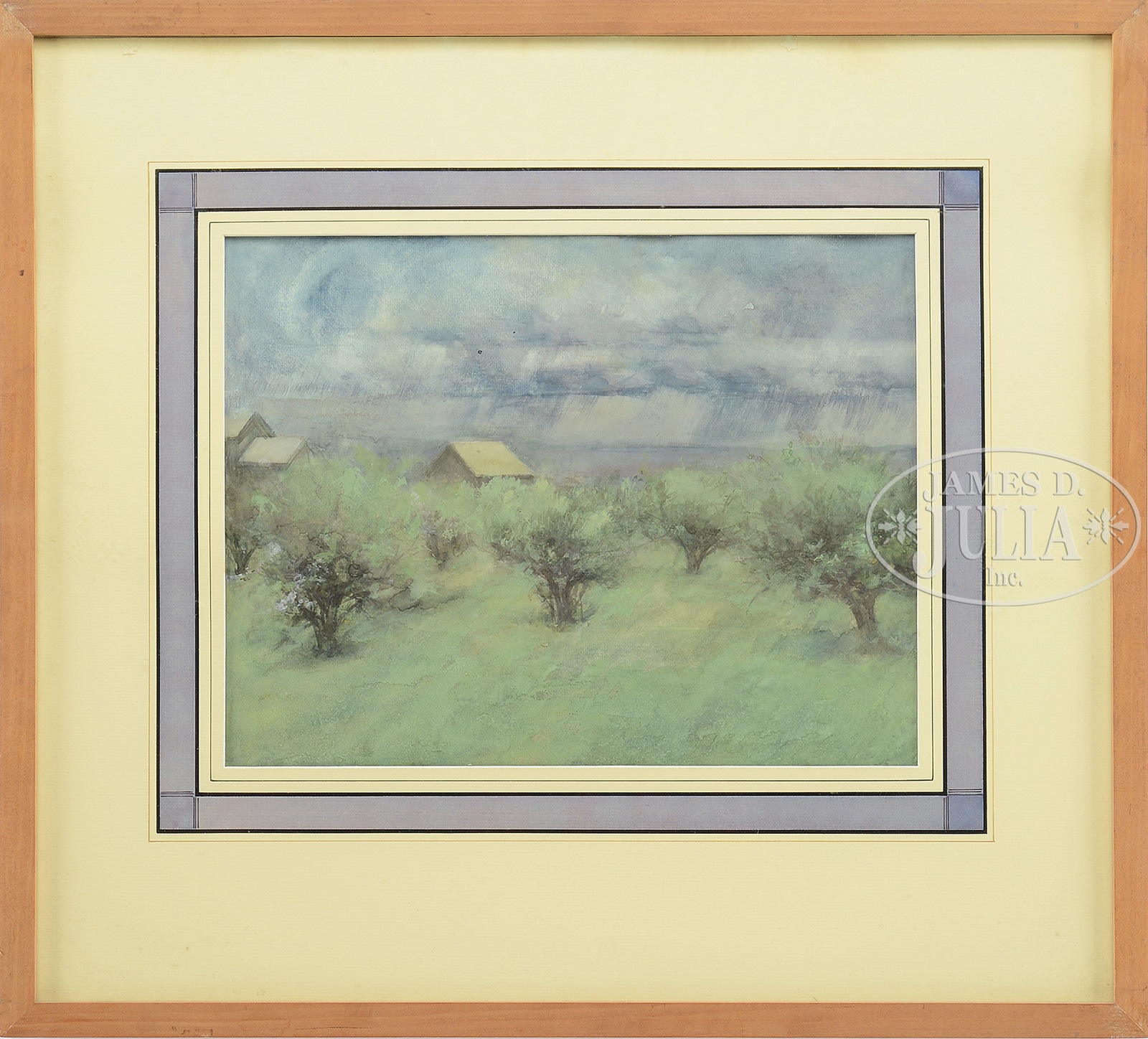 9 WORKS ON PAPER.1-3) Robert Yan (French, 1904-1994) three Brittany scenes. Watercolors. Housed in identical wood frames with mat. Signed lower right “Yan.” 4-5) Charles H. Rathbone Jr (American, 1902-1936). Lot of 2 French scenes Charcoal on paper. Both signed lower right one inscribed “Dourarnenez.” Framed in simple wood frames. 6-9) Edwin Augustus Moore (American, 1858 – 1925) four works, three landscapes and one head sketch. Three watercolors and pencil sketch. All housed in wood frames. Note: the double sketch has a National Academy of Design label on verso. One watercolor signed “E.M. 02”, the other two watercolors unsigned, the double sketch signed “EAM” SIZE: 1-3) Sight: 8-1/2″ x 11″ Overall: 13-3/4″ x 16″ 4) 9″ x 12-1/4″ Overall: 15″ x 20″ 5) 8-1/2″ x 11-1/2″ Overall 15″ x 20″ 6-9) Sight: 12″ x 17″, 13-1/4″ x 18-3/4″, 11-1/2″ x 15″ and double sketch 8-1/4″ x 5-1/2″ and 7″ x 4-1/2″ Overall: 19-1/4″ x 24, 22-1/2″ x 27-1/2″, 22-3/4″ x 25″, and 11-1/4″ x 13-1/4″ PROVENANCE: 6-9) Descended through family of the artist. CONDITION: Very good. 4-5) Not examined out of frame. 6-9) Some foxing. 9-93452, 93453, 93455 (400-800) – Lot 1303