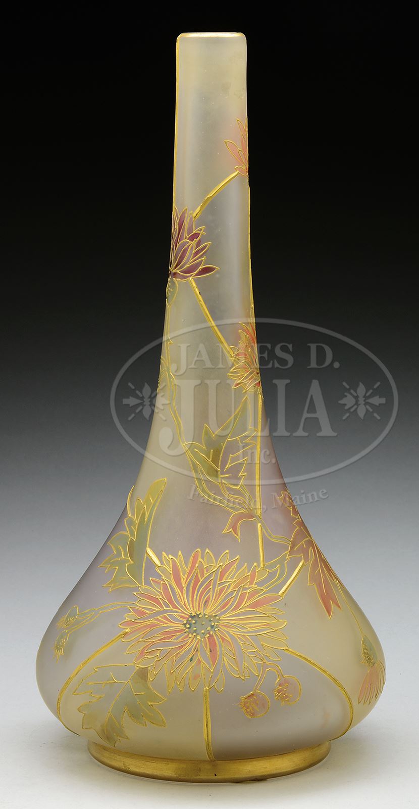 Royal Flemish vase is decorated with purple and pink Chrysanthemum blossoms, with pale green buds and leaves with gilded outlines, set against a clear frosted background with gilded foot and rim. Similarly decorated pieces are pictured in Mt. Washington Art Glass by Betty Sisk, p183 and p197. Unsigned. SIZE: 11-3/4″ t. PROVENANCE: From the Unreserved Collection of Mrs. Jackie & the late Dean Ballard. CONDITION: Very good to excellent with one tiny nick on body of vase. 50421-7 (1,500-2,500) – Lot 1303