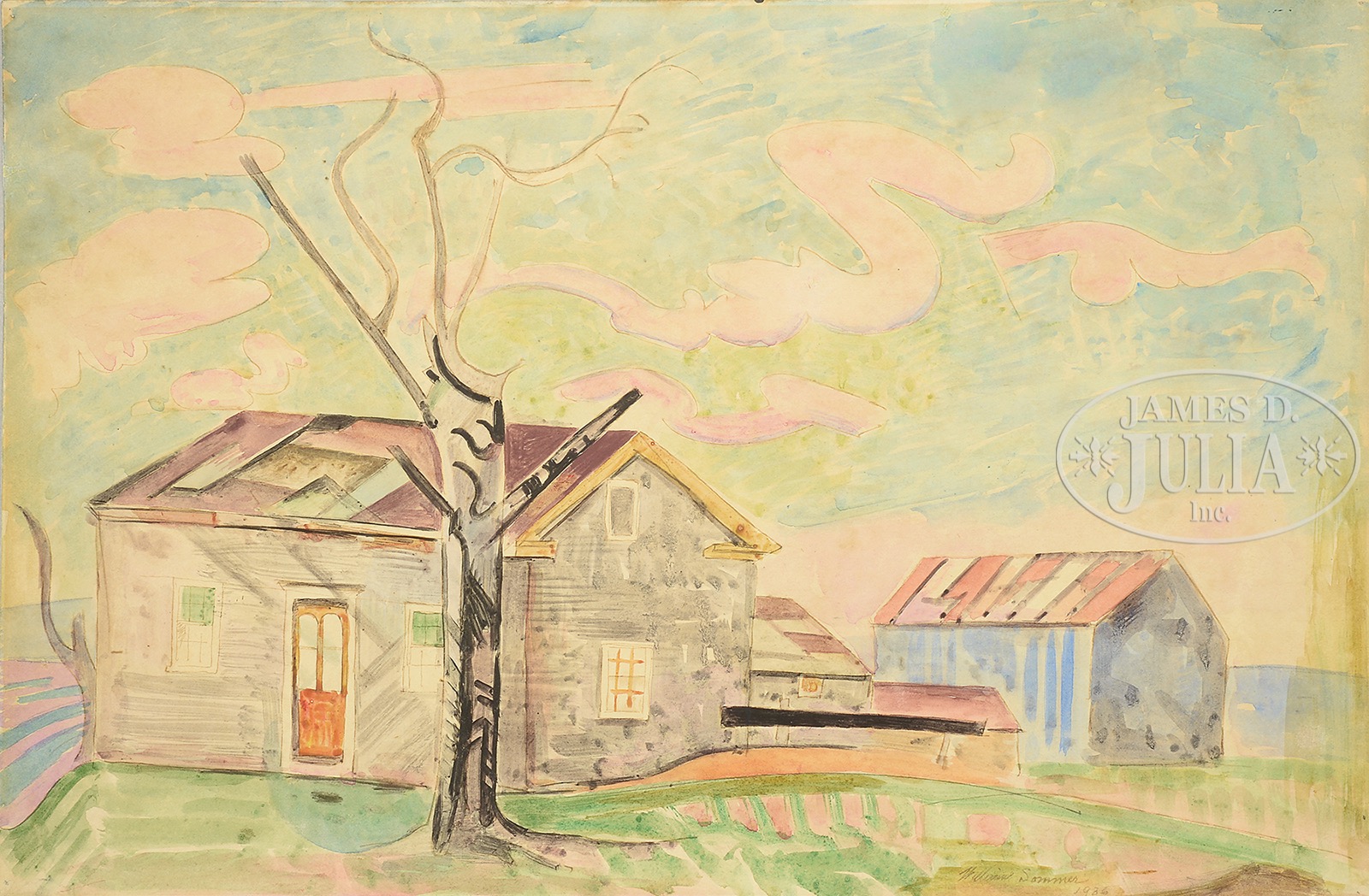 WILLIAM SOMMER (American, 1867-1949) “RESTLESS CLOUDS”.Watercolor Unframed Signed and dated “William Sommer 1936″ Accompanied by a tag from the 32nd May Show, The Cleveland Museum of Art, 1950 with artist & title SIZE: 12-1/2″ x 19” CONDITION: Age toning across painting, good 51203-8 (2,000-3,000) – Lot 1303