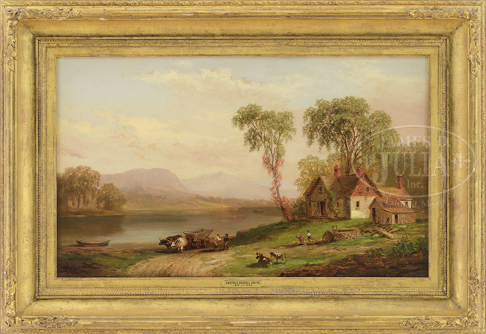 XANTHUS R. SMITH (American, 1839-1929) HOMESTEAD ON THE SUSQUEHANNA RIVER.Oil on canvas Housed in a modern giltwood frame Signed lower right “Xanthus Smith” Accompanied by a folder including a black & white image of the painting indicating “From the Collection of Frank S. Schwarz & Son, Philadelphia” SIZE: 16″ x 27″. Overall: 24″ x 35″. PROVENANCE: A landscape painting titled “Landscape on the Susquehanna” appears in the inventory of the Estate of Russel Smith, listed as in the 2nd floor study CONDITION: Lined, good with scattered re-touch 52273-2 (4,000-6,000) – Lot 1303