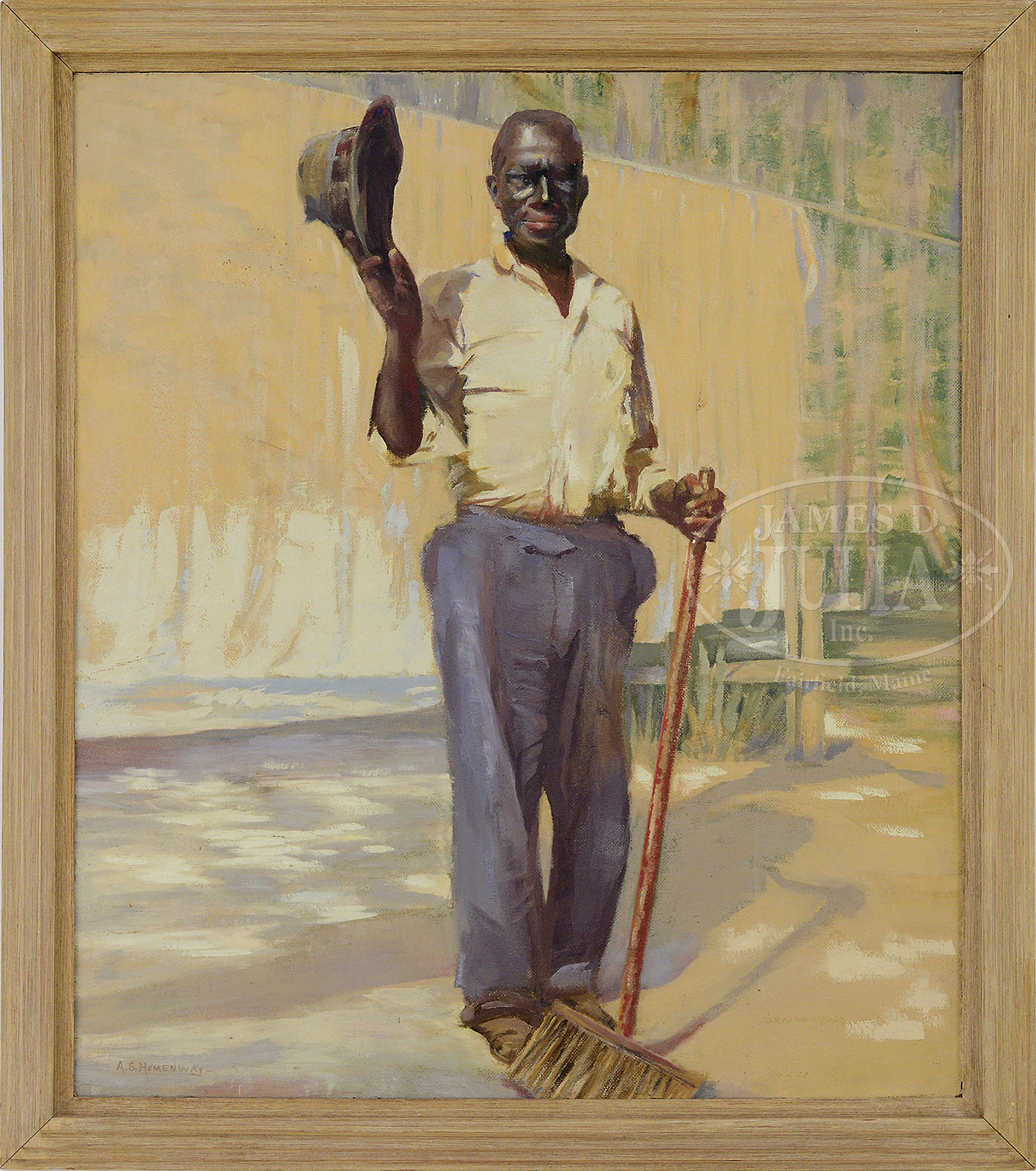ALICE SPAULDING HEMENWAY (American, 1866-) THE STREET SWEEPER.Oil on board Housed in a molded wood frame Signed lower left “A S Hemenway” SIZE: 38″ x 32-1/2″. Overall: 42-3/4″ x 38″ CONDITION: Inpainting, very good 52394-3 (1,000-1,500) – Lot 1305
