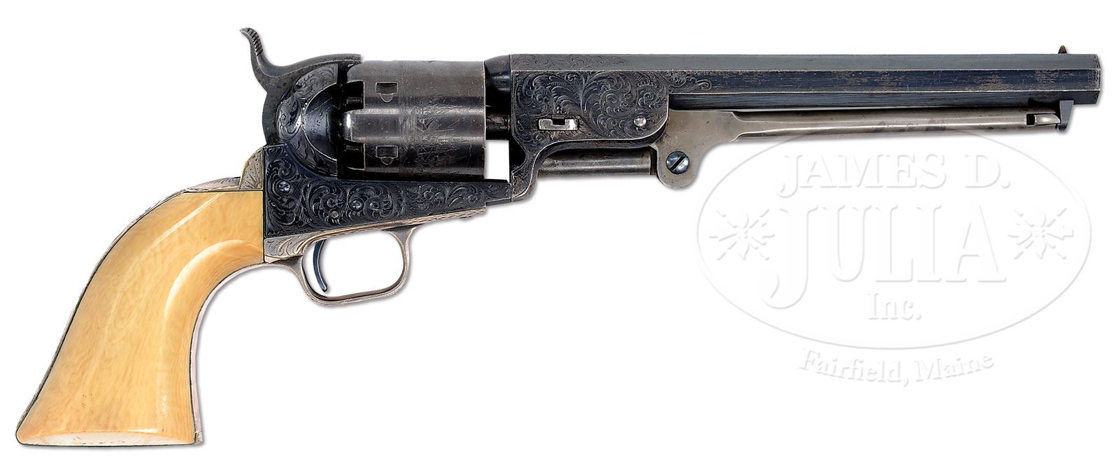 EXTREMELY RARE CASED ENGRAVED COLT MODEL 1851 NAVY PERCUSSION REVOLVER WITH BLUE FRAME.SN 12058. Cal 36. All blue bbl & frame with 7-1/2″ oct bbl, brass pin front sight and 1-line New York City address. Left side of frame is marked with a tiny “COLTS PATENT”. Cyl is usual six chambers with Ormsby Naval Battle scene roll marking. All six safety pins are crisp & serviceable. The silver plated small oval brass trigger guard & backstrap contain a spectacular 1-pc certifiable antique ivory grip. Grip is constructed with two slabs of ivory attached to a wooden spacer block. Revolver is beautifully engraved with about full coverage donut scrolls on the frame which extend over the bbl lug and onto top side flats. Backstrap is engraved to match with matching patterns on buttstrap & trigger bow. Top of backstrap is engraved in a fan pattern usually associated with Colt master engraver Gustave Young. Accompanied by an incredible brass bound rosewood casing with empty plaque in the lid. Interior is lined in burgundy velvet and French fitted in the bottom for the revolver, an unmarked smooth replacement flask, a straight legged brass bullet & ball mold marked “COLTS PATENT” on the bright steel sprue cutter, a packet of combustible cartridges, an L-shaped nipple wrench and a lacquered tin of Eley’s caps with green label. This revolver is a companion piece to a nearly identically cased & engraved Colt Model 1849 pocket percussion revolver being sold elsewhere in this auction. According to an eminently knowledgeable Colt collector/dealer orig blued frame percussion Colts are extremely rare with only a very few produced for a very short period of time. Blued frame percussion Colts are more commonly associated with revolvers having gold and special presentations. The companion piece Model 1849 Colt revolver mentioned above is pictured on p.64 of Colt Pistols, Wilson & Hable, identified by serial number, and was part of the prestigious R.E. Hable Collection. On p.65 of the referenced publication is a 4″ pocket revolver, SN 82380 which also has a blued frame. Pgs.52-53 of referenced publication illustrates a cased pair of blued frame 3rd Model Colt Dragoons, serial numbers 13128 & 13551. This same pair of Dragoons is pictured on p.51 of Samuel Colt Presents, Wilson, with credit to the Jack A. Dutton Collection. Special Note: This item contains or is made of ivory. Do not bid on this lot unless you have read and agreed to our “Ivory Position Statement” and the “Waiver of Legal and Financial Risk to James D. Julia in regards to your Purchase of an Ivory Object”. This information is located in our catalog on pages 30 and 31. CONDITION: Very fine, all matching except wedge which has numbers “31147” & “227”. Grip is unnumbered. Bbl retains 90-92% glossy orig blue with the loss areas flaked, not worn to a medium patina; rammer handle & pivot retain faded case colors, strong on left side of pivot; frame retains 97-98% glossy orig blue with slight thinning on sharp edge of recoil shield; hammer retains typical of the era light case colors, faded on top edge; cyl retains 75-80% thin orig blue and shows about 98% Ormsby Naval Battle scene roll marking and all of the Ormsby signature line; trigger guard & backstrap retain 96-97% strong orig silver, thinning on the heel of backstrap and a small area near the top with some flaking along the edges. Grip is sound with no discernible flaws and retains a wonderful, mellow ivory patina. Mechanics are crisp; brilliant shiny bore, may have been fired but if so very little. Case has a crack in the lid and another in the bottom otherwise is sound with usual handling & storage nicks & scratches and retains about all of its bright orig varnish, showing moderate wear on finial of brass corners. Interior of the lid is bright burgundy with one stain from contact with cyl. Both compartment lids are affixed with orig polished bone finials. Bottom of the interior is lightly faded with moderate soil under the revolver & flask. Flask has a series of dents on one side, otherwise is sound and shows 97-98% strong orig finish. Flask is probably an old replacement. Mold is crisp & clean with bright metal sprue cutter. Nipple wrench and other accessories are fine. 4-48084 JR219 (40,000-60,000) – Lot 1307