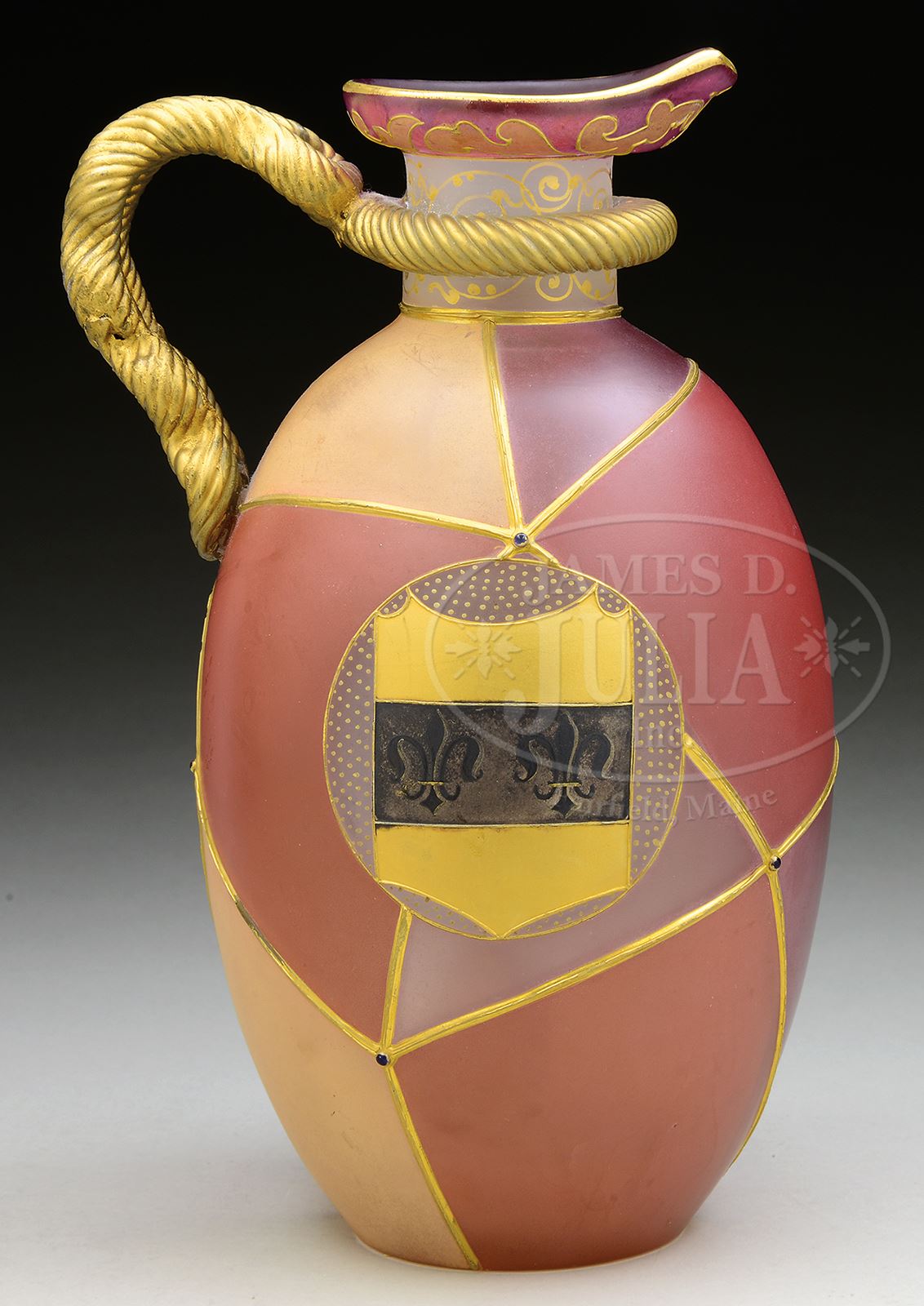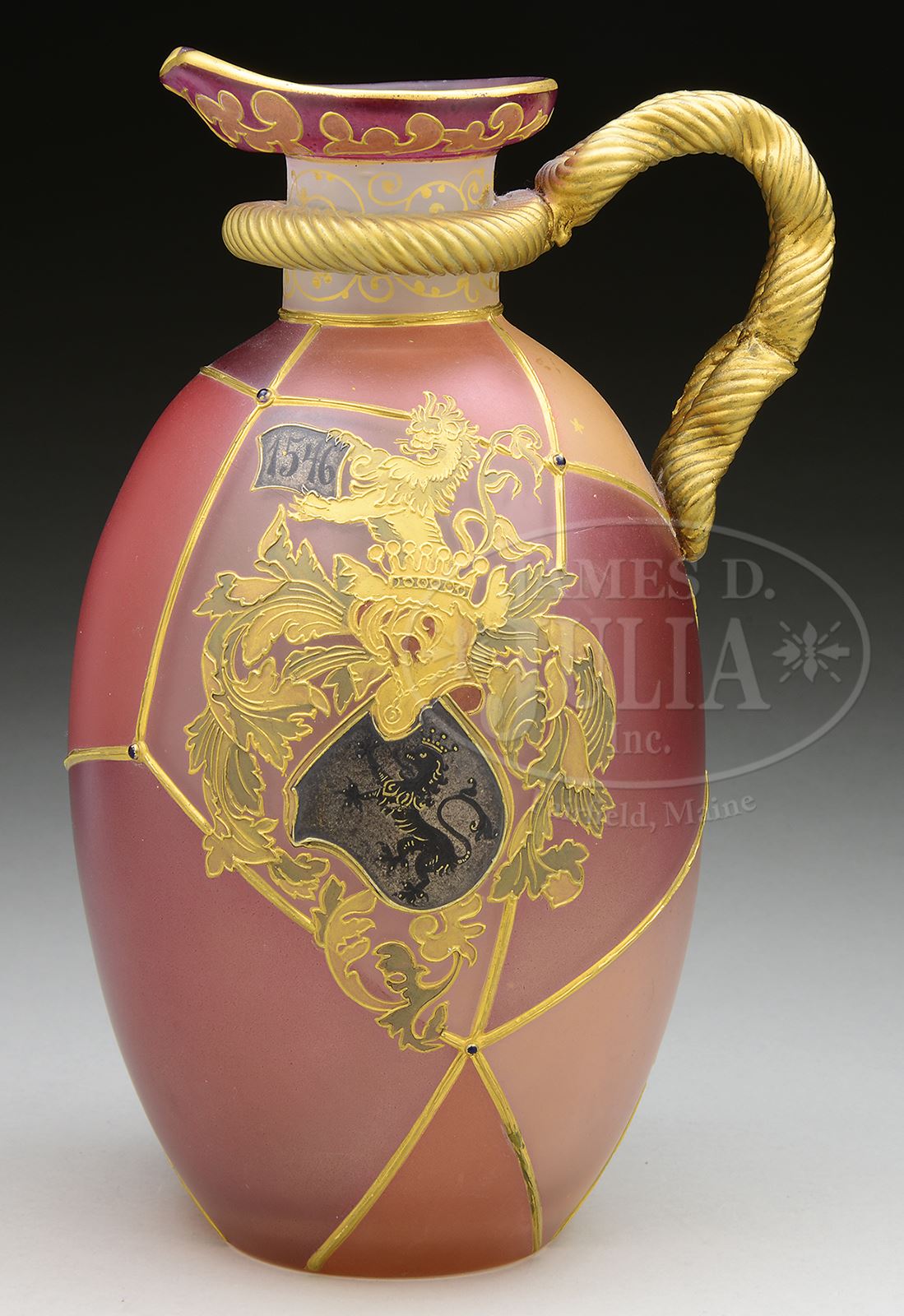 MT. WASHINGTON ROYAL FLEMISH 1546 COAT-OF-ARMS PITCHER.Royal Flemish pitcher is decorated with a stylized coat-of-arms in green and gold, having shield with helmet, crown, and lion holding a 1546 banner, the reverse having a gold shield with two black fleur-de-lis, all set against a cream, rose and burgundy background panels with gilded trim. The vase is further decorated with applied twisted rope handle and flared rim with stylized floral decoration on burgundy background. A ewer with similar decor is pictured in Mt.Washington Art Glass by Betty Sisk, p178. Unsigned. SIZE: 10″ t. PROVENANCE: From the Unreserved Collection of Mrs. Jackie & the late Dean Ballard. CONDITION: Applied handle has been separated and reattached with glue, and there is minor wear and loss to some gilding, otherwise very good. 50421-24 (500-1,000) – Lot 1307