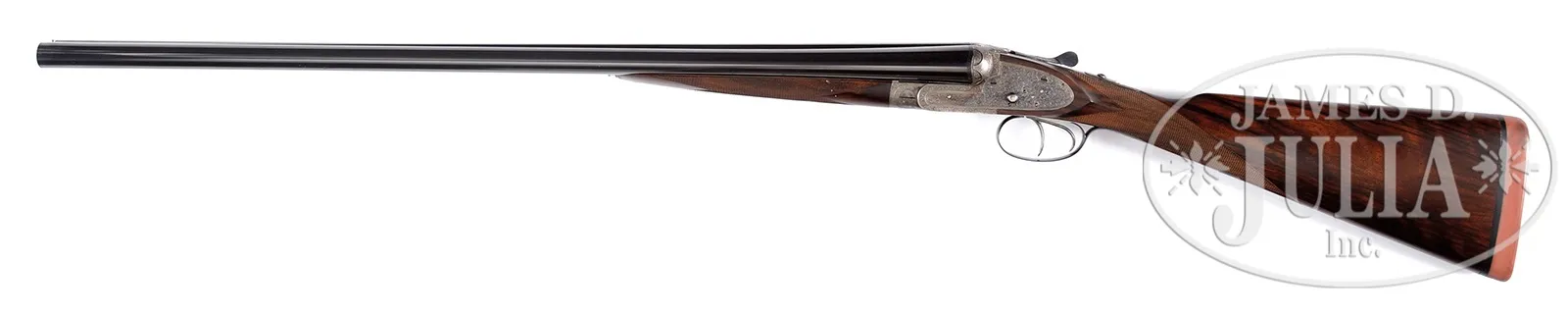 *EXQUISITE BEST QUALITY SIDELOCK EJECTOR SHOTGUN BY CHEVALIER-PARIS.SN 1823. Cal. 12 ga. 2-3/4″ Cham. 28″ bbls, choked IC/Mod, French nitro proof. Rib marked “CHEVALIER A PARIS”. Case colored sidelock action adorned with full coverage engraving of tight English scroll work surrounding floral bouquets, arcaded fences, cocking indicators, side clips, articulated double trigger. Top lever with gold crown and royal seal. Rich dark streaked walnut, splinter forend, straight grip. 14-1/2″ LOP over solid red pad. PROVENANCE: Remarkable William Larkin Moore Private Estate Collection of Fine Sporting Arms. CONDITION: Very fine as partially restored. Bbls retain virtually all of their fine blue finish with a few minor rubs and areas of light oxidation. Receiver retains most of its orig case hardening color. Stocks are sound with finely restored oil type finish, sharp checkering. Bores bright, mechanics crisp, action tight. 50595-29 JWD (5,000-7,500) C&R – Lot 1307