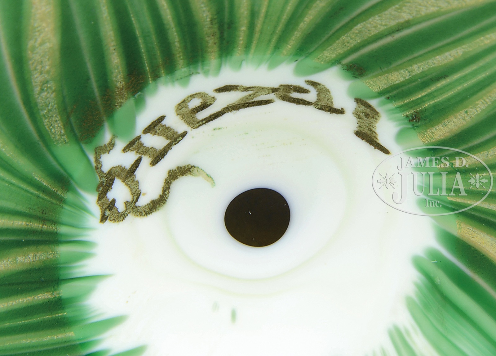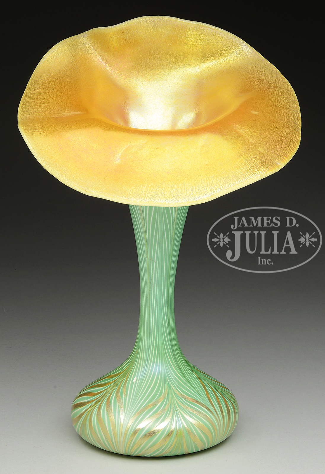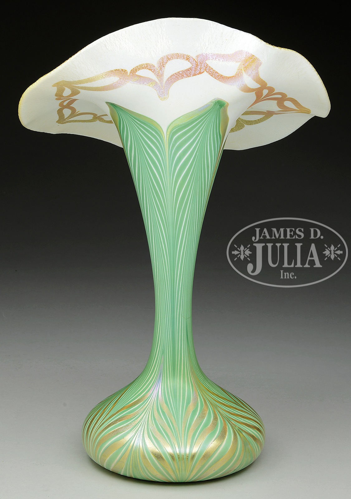 QUEZAL JACK-IN-THE-PULPIT VASE.Quezal Jack-in-the-Pulpit vase has green pulled feather design rising from foot to top of neck. Each pulled feather is outlined at the top in gold iridescence. Foot is further decorated with gold iridescent pulled feathers overlaid on the green pulled feathers. Back of flaring rim is decorated with a gold iridescent heart chain against a bright white background. Face of the Jack has bright gold iridescence with subtle pink highlights. Signed in polished pontil “Quezal”. SIZE: 14-1/4″ t. CONDITION: Very good to excellent. 49774-38 (4,500-6,500) – Lot 1308