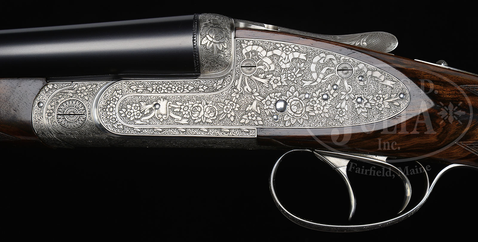 *SELDOM SEEN LUCIANO BOSIS “QUEEN” SIDELOCK EJECTOR GAME SHOTGUN WITH CASE.SN 034. Cal. 20 ga. 27-3/4″ Bbls with flat matted rib, are engraved with makers name and address on tops. Bbl flats are stamped with 1985 Italian nitro proofs for 20 ga, as well as importers name and address (BSA). Coin finished small frame sidelock action features non-automatic safety (SECURA engraved), bushed strikers, and dbl triggers (front articulated). Action is engraved with full coverage Baroque sprays of ribbons, roses and other blossoms in a background of small scroll. “L. BOSIS TRAVAGLIATO” is in draped scroll device on bottom of action. Engravers signature is on trigger plate. Single beaded trigger guard has matching scroll and floral engraving. Finely marbled and lightly figured European walnut straight grip buttstock measures 14-1/4″ over checkered wood butt. Point pattern checkering is at semi diamond grip, and a gold shield device is inlet into toe line and engraved with monogram “SB”. Matching long splinter ejector forend has Anson release. Bore diameter: left -.627, right – .627. Bore restrictions: left – .029 (full), right – .018 (mod). Drop at heel: 2-1/8″, drop at comb: 1-3/8″. Neutral cast. Weight: 6 lbs. 0 oz. LOP: 14-1/4″. Brown leather case with stitched leather corners by Nizzoli is lined in olive felt and has gold embossed black leather Bosis label in lid, and contains straps and key. CONDITION: Excellent, with evidence of light field use, but very little firing since proof, retaining nearly all of its orig finishes, but with a number of light marks, dings, and scratches, most notably some ring marks at grip. There are some incipient grain checks at grip with repairs. Otherwise mechanically fine. Case is fine with a number of scuffs and rubs, interior excellent. A new Bosis “Queen” has a current retail of 30,000 euros without engraving. 51666-1 MGM137 (15,000-25,000) – Lot 1308