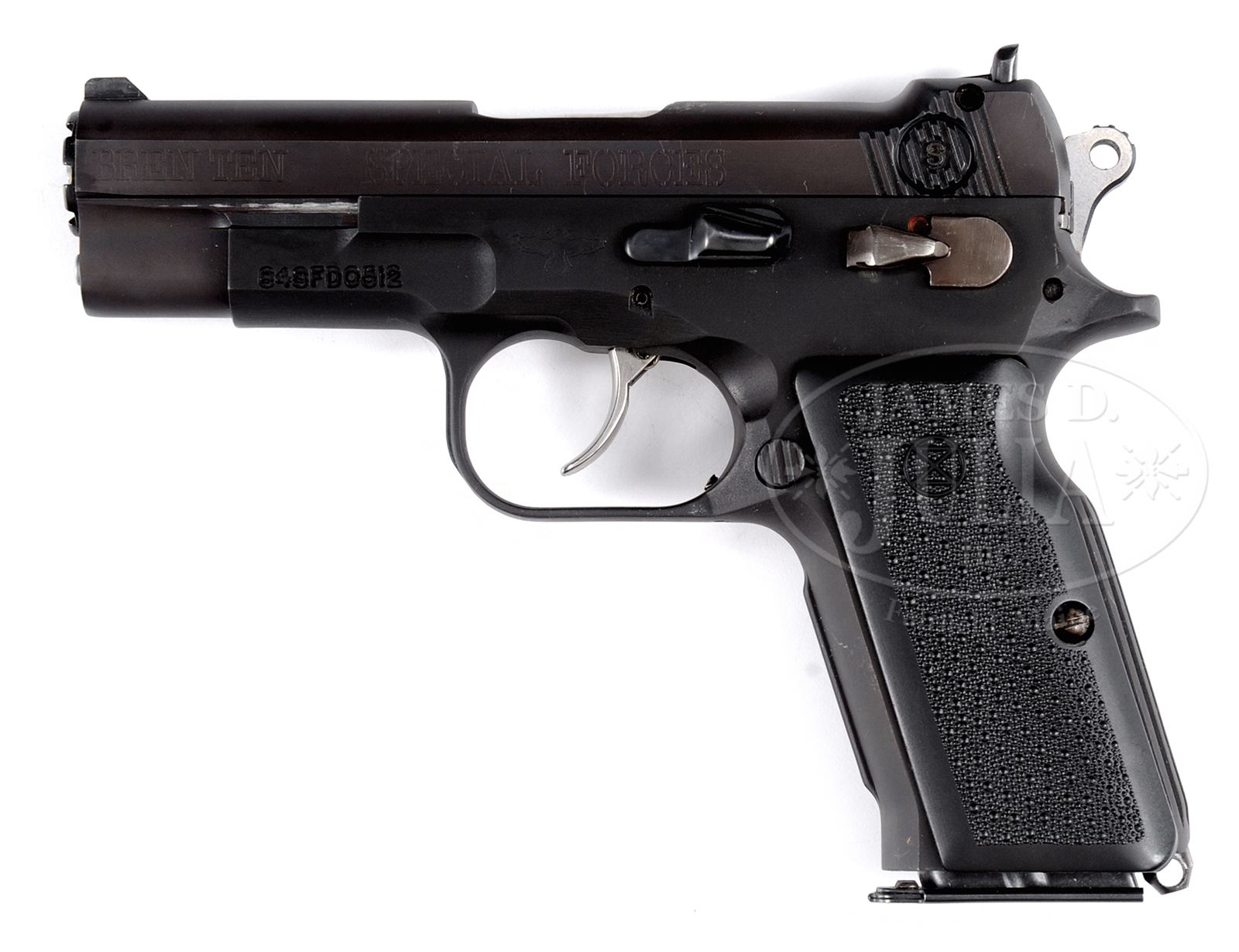 *BREN TEN SPECIAL FORCES MODEL WITH DARK SLIDE.SN 84SFD0512. Cal. 10 mm. 4-1/2″ bbl. The BREN TEN produced only between 1983-1986 is considered by firearms enthusiasts to be one of the strongest and most desirable of the 10 MM semi-auto pistols. This model was popularized by its use in the TV series “Miami Vice” as the preferred handgun of character Sonny Crockett. This “Special Forces” dark slide model includes one 10-rnd 10 mm magazine and includes a cardboard shipping box with hand written gun SN applied. This pistol features a push button safety mounted on the slide beneath the cocking serrations for easy and quick access, as well as a thumb safety on the right side of the slide in this case, which can be changed over to the left side for left handed firers. Marked on right side of frame with Dornaus & Dixon ENT., Inc., address and on left of slide BREN TEN SPECIAL FORCES, this specimen was manufactured about a 1/3 of the way through the run of about 1,500 pistols. CONDITION: Overall finish and appearance very good to near excellent. Matte non-reflective blue finish with bright bbl, hammer and trigger. There is some loss of finish on the slide where it contacts with frame rails upon recoil and upon extreme close inspection, the slightest of handling marks on the forward edge of the trigger guard. Hard black composite grips near excellent. This pistol has been fired. The bore is excellent, shiny and bright. This is a great opportunity to acquire a top quality pistol with superior stopping power. 49616-2 JWK28 (2,000-2,500) – Lot 1309 Click here to view provenance