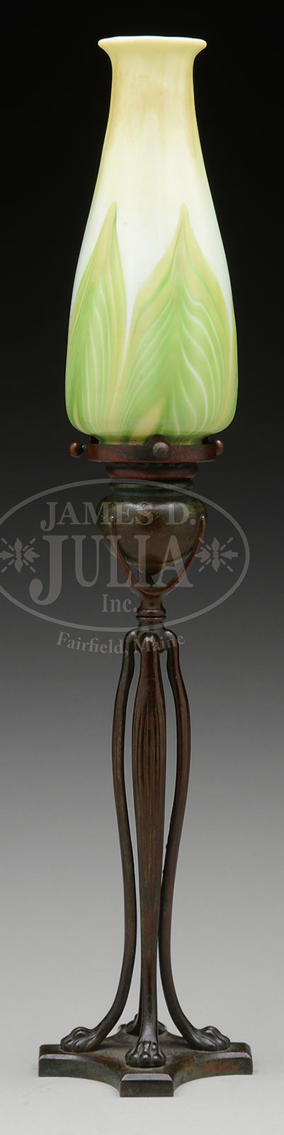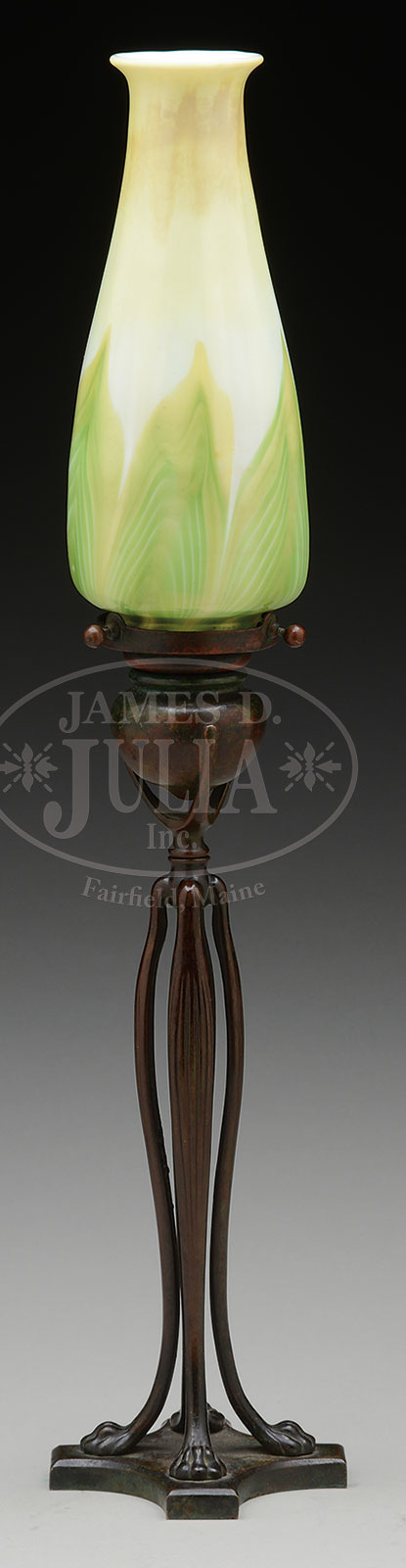 TIFFANY STUDIOS CAT’S PAW CANDLE LAMP.Tiffany Studios candle lamp has bronze candlestick base with four vertically ribbed legs terminating in cat’s paw feet. The legs support a bulbous candle cup held within 3-prongs. The base is finished in a rich brown patina and is signed on the underside “Tiffany Studios New York S692 1201”. The lamp is completed with a Tiffany Favrile glass shade decorated with green pulled feather design against a cream colored background. Shade is signed in the fitter “L.C.T.”. SIZE: 19″ t. PROVENANCE: From the Unreserved Estate of Lynda Cunningham. CONDITION: Base is very good to excellent with some very minor wear to patina on foot. Shade has two small flakes on the fitter rim which are completely concealed when the shade is in place. Otherwise, very good to excellent. 51361-146 (1,500-2,500) – Lot 1309