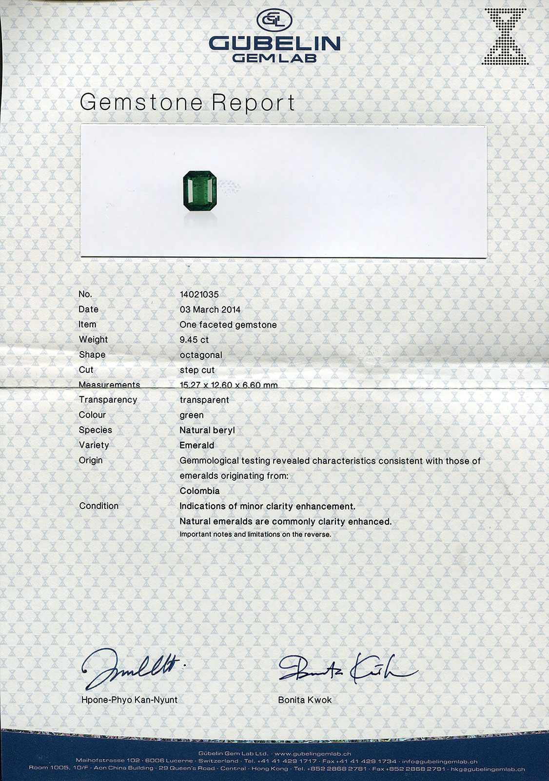 14kt white gold lady’s ring has emerald cut Columbian emerald weighing 9.45ct. Emerald is surrounded by two rows of round brilliant cut diamonds, a total of 52 diamonds. The split shank is also set with single cut diamonds. Ring comes complete with a gem report on the emerald from Gubelin Gem Laboratories in Switzerland, report No. 14021035, stating the stone measures 15.27 x 12.60 x 6.60mm. Stone is transparent and is a natural emerald and the testing revealed characteristics with those of emeralds originating from Columbia. Report also lists indications of minor clarity enhancements and notes that natural emeralds are normally clarity enhanced. SIZE: 7. PROVENANCE: From a private New Jersey Collection. CONDITION: Very good to excellent. 48971-6 (60,000-80,000) – Lot 1310