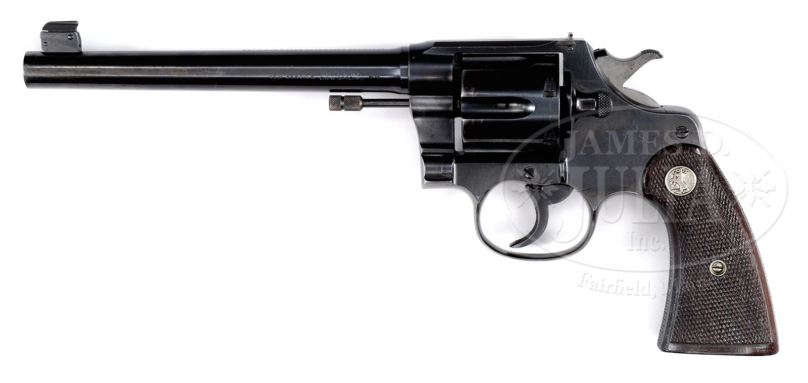 *COLT NEW SERVICE TARGET REVOLVER WITH CHECKERED WALNUT GRIPS.SN 328046. Cal. 44 Russian & Special. 7-1/2″ bbl, blue finish, target sights, checkered forestrap and backstrap, checkered trigger, checkered walnut grips with Colt medallions. CONDITION: Very good. Bbl retains 80% blue with some muzzle wear and staining on sides of bbl. Bbl address is sharp, Cal marking is sharp. Bore is bright with strong rifling. Cyl retains 60% bright blue with deep blue in flutes. High point wear at front and rear of cyl. Slight drag mark. Chambers are good. Frame retains 80% dulling blue with a matted top strap. Slight scratching overall. Some high point wear behind hammer and behind trigger guard. Grips are very good with only a few slight mars. Medallions are fine. A very good New Service Target Model revolver in a rare caliber. 49583-13 TEP C&R (1,500-2,500) – Lot 1310