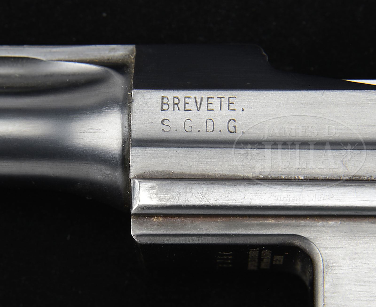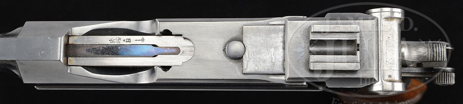 *◊ CHARISMATIC BERGMANN M1910 WITH WOOD/LEATHER SHOULDER STOCK.SN 6256. Cal. 9mm Bergmann Bayard. Very few M1910s were cut for a shoulder stock. This example has the standard 4″ bbl with fixed front and rear sight. Left side of receiver is marked “BREVETE / S.G.D.G.” followed by “ANCIENS ETABLISSEMENTS PIEPER / HERSTAL-LIEGE. / BERGMANN’S PATENT.” Usual Belgian proofs are on the right side of the bbl, chamber, and frame. Major parts are rust blued while the bolt, hammer, trigger, safety, and magazine release are in the white. Fire-blued extractor. Factory matching magazine with concentric circles corresponding to frame cutout. Orig wood grips with pressed and cut checkering, each panel numbered to match pistol. Accompanied by scarce wood/black leather shoulder stock whose lid may be a replacement as color and texture are different than the body. Rust blued lug fits pistol very securely. PROVENANCE: Collection of Dr. Geoffrey Sturgess. CONDITION: Pistol retains 98% orig rust blue with minor fading of the front and backstrap, particularly below stock slot. Comparable condition small parts with minor oxidative staining. Grips with orig varnish and only a few light dings. Very bright bore with sharp rifling. Perfect mechanics. Stock in near excellent condition with superficial scuffs to body, minor handling marks on lid that has been lightly inked “6256” to match pistol. A very desirable, high condition ensemble seldom offered for sale. 4-52044 LMA70 (8,000-12,000) – Lot 1311