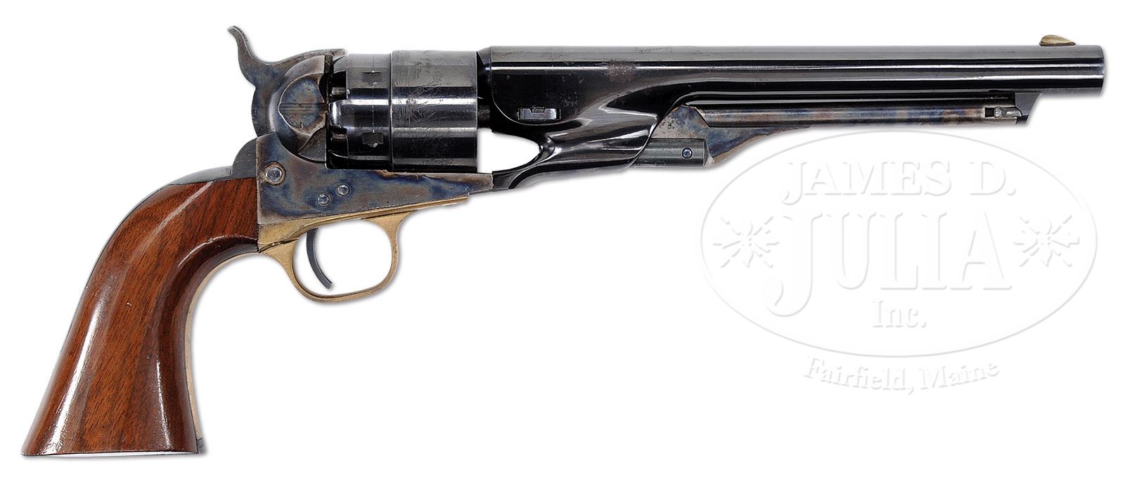 EXTRAORDINARILY RARE NEW AND UNFIRED CASED COLT MODEL 1860 ARMY PERCUSSION REVOLVER.SN 152329. Cal 44. Blue & color case hardened with 8″ rnd bbl, nickel silver front sight and 1-line New-York U.S. America address. Left side of frame is marked “COLTS PATENT” and left shoulder of trigger guard is marked “44 CAL”. Cyl is rebated with Ormsby Naval Battle scene roll marking and five of the six safety pins serviceable. The un-plated brass trigger guard & blued steel backstrap contain a varnished 1-pc walnut grip. No disassembly was effected to check for matching SNs. Frame is 3-screw type cut for shoulder stock with rnd head hammer screw. Accompanied by an orig, burgundy velvet lined mahogany casing with an engraved plaque in the lid bearing the crest of an armored arm clutching an arrow in its hand, all over a six section rope-like ribbon. A quick Google search initially turned up this exact crest as belonging to David Fletcher. Additional search was enormously extensive. With time and resources undoubtedly additional information could be developed. Interior, in the bottom is compartmented for the revolver, a double sided trophy of arms & flags “COLTS PATENT” flask with long angle spout, a blued steel “COLT’S PATENT” bow-legged bullet & ball mold with sprue cutter marked with a “C” on right side, a brass mushroom head steel cleaning rod, an L-shaped nipple wrench and an orig paper sealed tin of Eley’s caps with tan label. The Model 1860 Colt was the most widely used sidearm in the Civil War with about 200,000 manufactured 1860-1873. A total of about 127,000 of these revolvers were purchased by the U.S. Government and virtually the entire production saw service throughout the Civil War and later on the American frontier where they remained equally popular. They continued in service well into the late 1870s even after the advent of self-contained cartridge revolvers. By the end of the Civil War nearly 156,000 of these revolvers had been produced most of which had been sold to the U.S. Government leaving very few for civilian purchase. Even those were mostly private purchase by military personnel for use in the Civil War. This revolver was produced in 1864 while the Civil War was still raging and therefore must have been a present for a departing soldier, a high ranking military officer or someone of political importance or great wealth. That it has remained in pristine unfired condition with an equally pristine presentation case is the ultimate find for a Civil War era firearm. CONDITION: Extraordinarily fine, all matching (grip was not checked). Overall retains 99%+ orig factory finish with brilliant charcoal blue and crisp case colors. Cyl is equally new & unfired although it has been “played with” and shows light front edge wear, a small ding and some slight thinning with minor flaking and shows 99% Ormsby Naval Battle scene roll marking. Chambers of the cyl & bore retain virtually all of their orig factory blue; trigger guard is a medium mustard patina with crisp, sharp edges; backstrap shows light wear on the heel with some scattered light flaking. Grip is sound with a few minor nicks and one small spot of wear on left side and overall retains about 98% crisp orig varnish. Mechanics are crisp; brilliant shiny, unfired bore. Case is sound with a few minor, light nicks & scratches, a small chip from bottom front edge and overall retains virtually all of its crisp orig varnish; plaque in the lid retains about all of its orig gold wash. Interior is crisp & bright with only a small impression from the revolver cyl and all partitions are solid. Flask retains about 96-97% strong orig finish. Mold has some fine pitting on left arm, otherwise is crisp and unused. Cleaning rod & nipple wrench are equally new. Cap tin has some minor paper losses but is still sealed with lightly faded label. An incredible find, the equivalent of which probably never to be seen again. 4-48086 (85,000-100,000) – Lot 1313