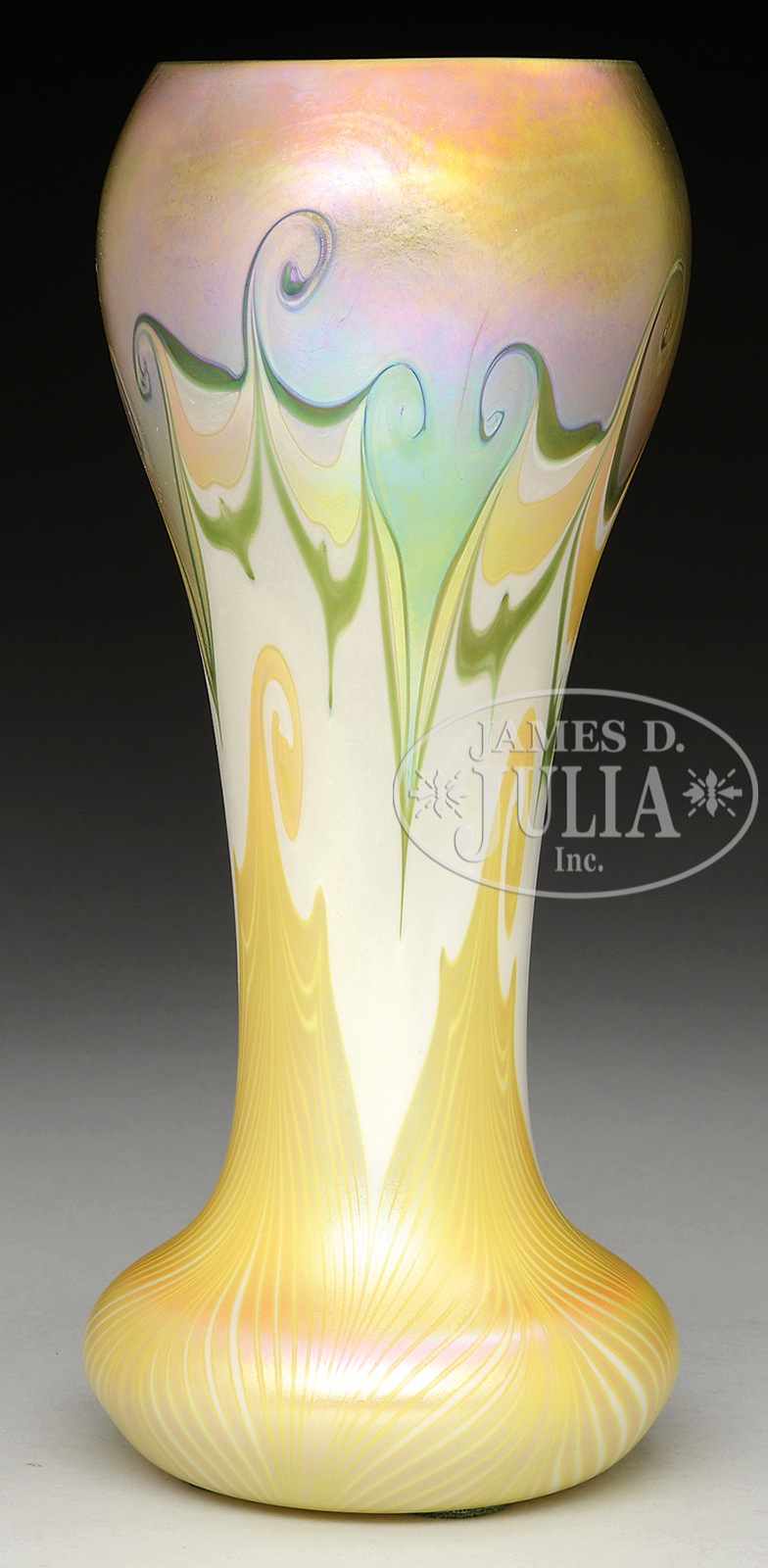 QUEZAL HOOKED FEATHER VASE.Quezal vase has gold hooked feather design rising from the foot and gold iridescent hooked feather design with green outlines descending from the lip, all against a creamy white lightly iridescent background. Signed in the polished pontil “Quezal A403”. SIZE: 10-1/4″ t. CONDITION: Very good to excellent. 49698-12 (2,500-3,500) – Lot 1313