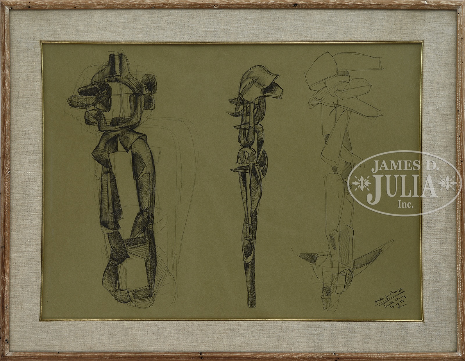 DIMITRI HADZI (American, 1921-2006) STUDIES FOR BRONZE.Pen and ink on paper Housed in an oak frame with linen mat having gold edge Signed and titled lower right “Studies For Bronze, Dimitri Hadzi Spring ’59 Roma”, also having two exhibit labels on reverse one from Stephen Radich Gallery, N.Y. and Rental Gallery Baltimore Museum of Art. SIZE: Sight 18″ h x 25″ w. Overall 24″ h x 31″ w. CONDITION: Very good. 49368-2 (400-600) – Lot 1314