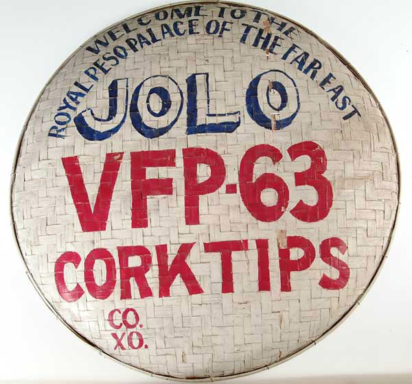 BAMBOO ADVERTISING SIGN. 23″ dia. Painted in white, red and blue. CONDITION: Some chipping to bamboo and paint. FS887 4-47599 (50-100)