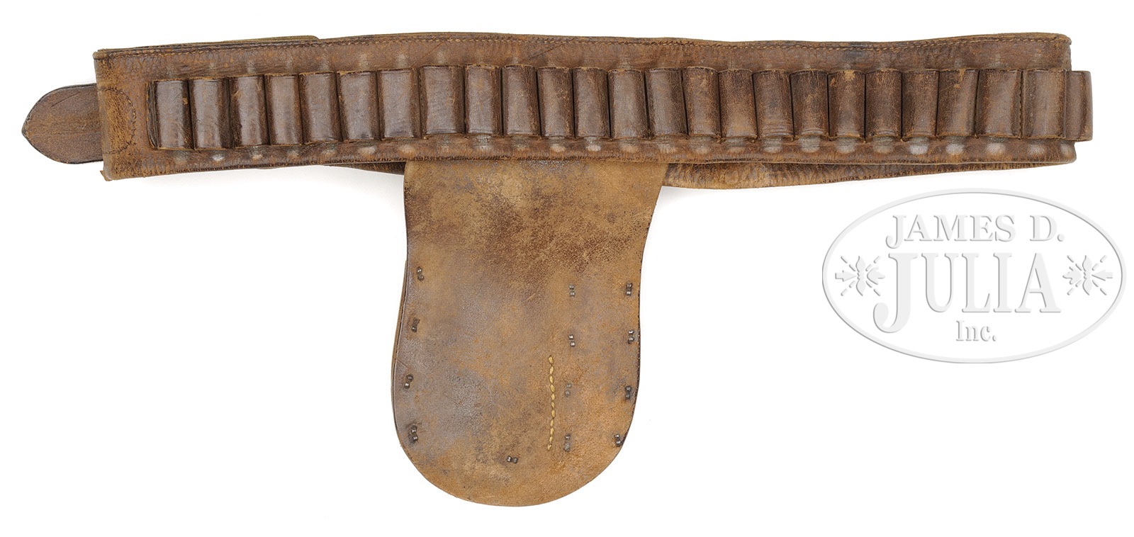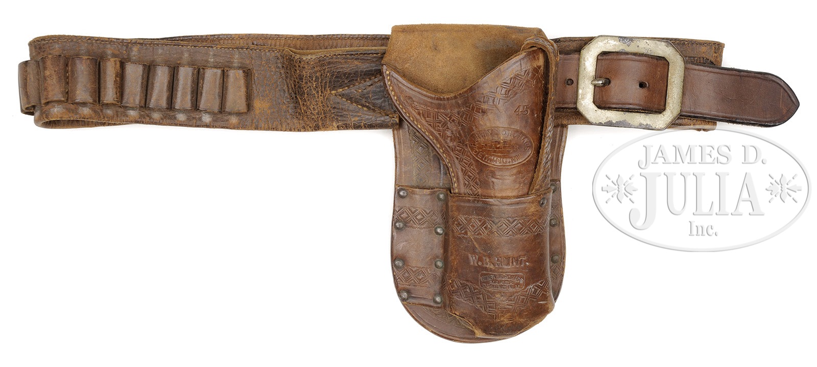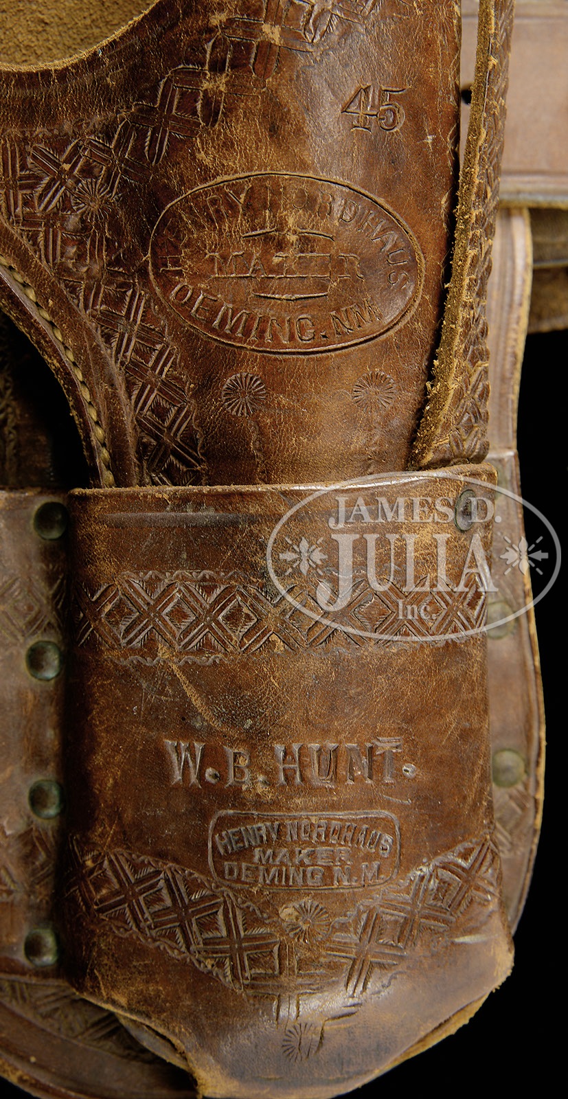 HENRY NORDHAUS SINGLE ACTION HOLSTER WITH HAMMER STRAP.This is a nice condition “pouch style” 4-3/4″ single action holster with two large different “HENRY NORDHAUS maker DEMING, NM” cartouches, one on body of holster and one on pouch. Holster is also stamped with a large “45” in the upper right side of holster beneath basket weave embossed edge decoration. The cowboy’s name “W.B. HUNT” is stamped boldly in 1/4″ letters. Holster is attached to a 35″ single loop money belt marked “DENVER MFG CO MAKERS”. This is a rare holster in unusual configuration in very nice condition. PROVENANCE: Tommy Rholes Estate Collection. CONDITION: Holster is very good condition overall, retaining most of its orig brown finish with scuffs to raised areas. Hammer strap is sound and supple with basket weave design with some scuffing and loss of finish around hole that went over trigger. Belt is very average condition overall, supple and sound with stitching around top in need of repair; bullet loops are sound and solid with scuffing to high parts; tongue is recent addition; belt is also marked “45 C”. 4-50777 JS201 (4,000-6,000) – Lot 1316