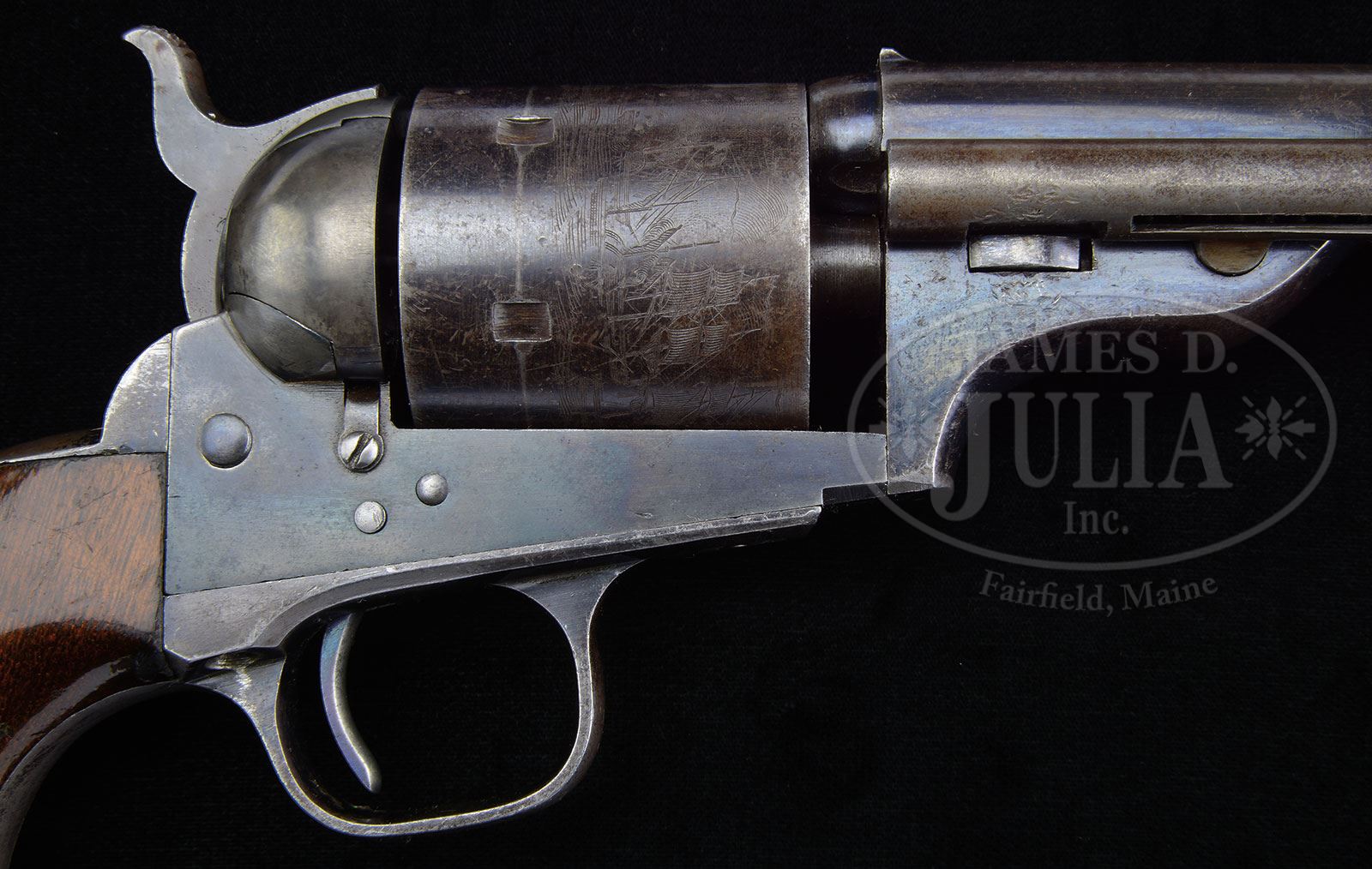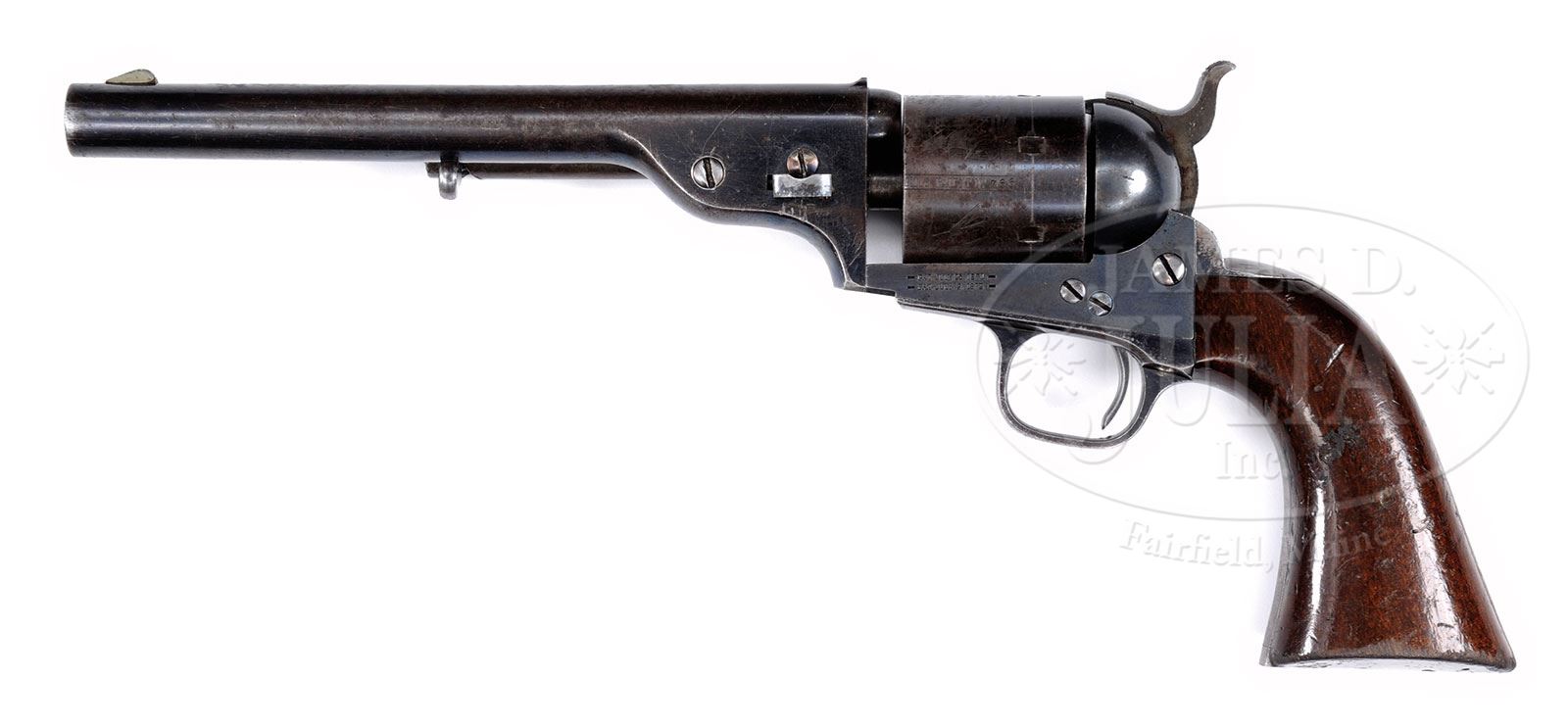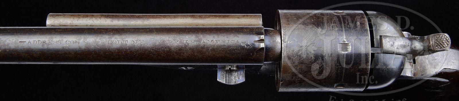 RARE COLT MODEL 1871-1872 OPEN TOP SINGLE ACTION REVOLVER.SN 1766. Cal. 44 RF. Blue finish with 7-1/2″ rnd bbl, nickel silver front sight and 1-line New-York U.S. America address with dashes. Top rear of bbl, over the forcing cone has an integral, V-notch rear sight. Right side of bbl lug has an attached ejector with bullseye ejector rod head. Left side of frame has the 1871 and 1872 patent dates. Hammer nose was altered by having the firing pin attached to the left side with two rivets. Loading gate in the right recoil shield has an external spring and the assembly number “790”, which is also found on the cyl spindle. The blued steel trigger guard & back strap contain an Army-sized varnished 1-pc walnut grip with matching SN in back strap channel. There were about 7,000 of these revolvers produced 1872-1873 with new-made bbls and frames. Some frames, however, had the “COLTS PATENT” over-stamped by the patent dates. This apparently is one of the orig frames and is without the “44 CAL” marking on left shoulder of trigger guard. This model was the immediate predecessor to the venerable Colt Single Action Army Model of 1873. During their short production run they were widely distributed and very popular on the American Frontier. However, when the centerfire cartridge revolvers came on the market they quickly lost favor to the solid frame of the new revolvers. The majority of them wound up in Mexico where they saw very hard service. They frequently had their bbls cut and are rarely found today in orig configuration with orig finish, especially those with orig blue finish. After having examined many of these revolvers over the years it is this catalogers conclusion that there were far more revolvers of this model with nickel finish than with blue and it is very rare to find a blued revolver with orig finish. CONDITION: Very fine, all matching except wedge which is properly unnumbered. Bbl retains 60-70% strong orig blue turning brown with some freckles of rust over the top; ejector housing is mostly a mottled brown patina; frame retains about all of its orig case colors, turning dark; hammer retains strong case colors on sides and rear edge turned silver on top; trigger guard retains blue on the trigger plate with the front strap, back strap, butt strap & trigger bow a gray metal patina. Grip is sound showing moderate edge wear with a few nicks & dings and retains about 88-90% orig varnish; cyl retains about 60% thin orig blue and shows about 90% Ormsby Naval battle scene roll marking; front edge of cyl has a ding over one chamber. Mechanics are crisp, brilliant shiny bore; shows very little use. 4-55318 JR294 (15,000-25,000) – Lot 1318
