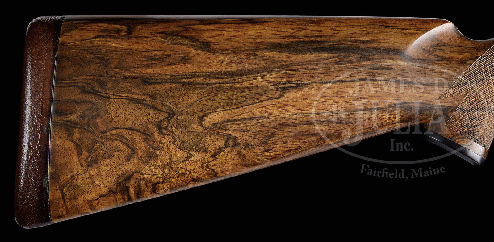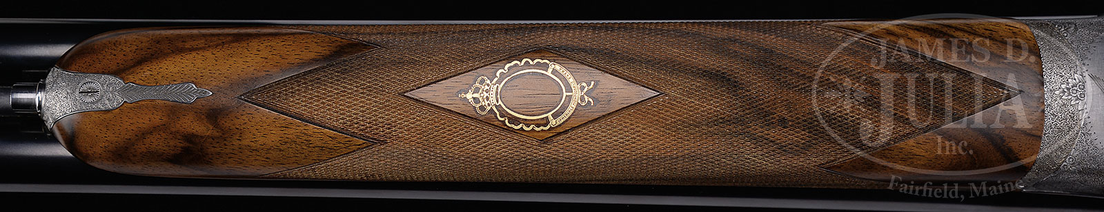 *VERY FINE LUIGI FRANCHI “IMPERIALE MONTE CARLO EXTRA” SIDELOCK GAME GUN WITH FINE GAME SCENE ENGRAVING BY F. GALEAZZI WITH CASE.SN 15159. (1997) Cal. 12 ga. 2-3/4″ Chambers. 28″ Chopper lump bbls with slightly raised, matted game rib, are engraved “FRANCHI S. P. A. BRESCIA MADE IN ITALY” on side of left bbl. Bbl flats are stamped with 1997 Italian nitro proofs for 2-3/4″ chambers, and side of right bbl is engraved with importers name and address (Beretta USA). Coin finished sidelock action features non-automatic safety (S inlaid in gold), bushed strikers, and single non-selective trigger. Action is engraved with full coverage well cut minuscule scroll, as background to sprays of roses and foliage, surrounding nicely rendered Bulino game scenes; hunter firing at flight of doves on bottom of action; flock of geese settling into marsh on left lockplate, and a covey of quail flushing as pair of pointers, one pointing, look on. Each scene is signed at bottom by the highly regarded “F. Galeazzi”. Single beaded small bow trigger guard with matching scroll has SN at grip. Nicely marbled and lightly figured, dense European walnut capped pistol grip buttstock measures 14-3/4″ over brown leather covered pad and features standard point pattern checkering. Matching splinter ejector forend has Anson release, and nicely inlet gold device engraved with grade (Imperiale Monte Carlo Extra) on central diamond. Bore diameter: left -.722, right – .723. Bore restrictions: screw chokes. Drop at heel: 2-1/4″, drop at comb: 1-1/2″. Cast off approx 1/4″. Weight: 7 lbs. 9 oz. LOP: 14-3/4″. Good quality dark leather case is lined in green felt, and has dark leather gold embossed Franchi label in lid. Case contains rosewood and brass 3-pc cleaning rod, a pair of rosewood and brass snap caps marked with grade, three Briley spare choke tubes (2 in gun), and an installation wrench. CONDITION: Excellent, with little evidence of use, with only some minor marks in what appear to be orig finishes. Bores are excellent. Action is tight. Ejectors are strong and in time. Trigger appears to work. Case leather is excellent, but shows minor scuffs. Interior cloth is excellent, lightly soiled. Label has some dings. This model is currently imported by Beretta, and is very expensive. 51639-3 (10,000-15,000) – Lot 1320