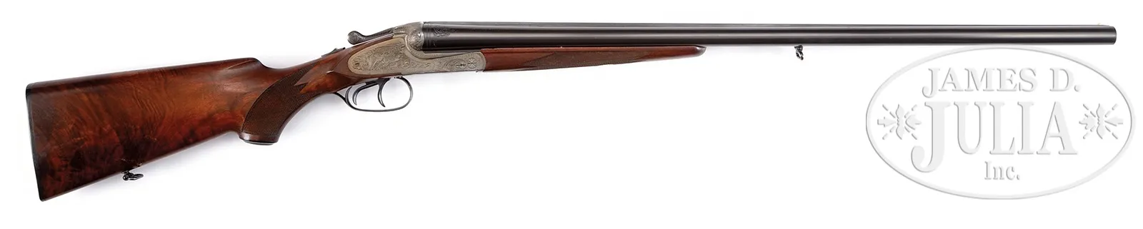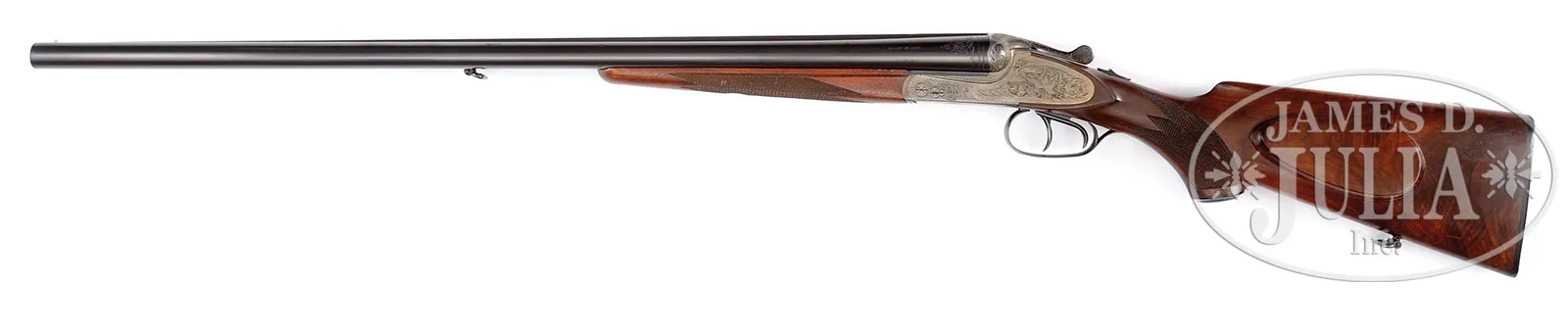 *MERKEL MODEL 122E SXS SHOTGUN.SN 770831. Cal. 12 ga. Bbls: 28″ special steel with solid rib. Standard front faux-ivory bead. Right bbl is marked “GEBR. MERKEL SUHL/MADE IN GDR”. Fixed MOD & FULL chokes. 2-3/4″ chambers as marked. Coin finished sideplated boxlock action with side clips, cross bolt and cocking indicators. Deep relief game scene engraving featuring pheasants on right with mallards on left lock surrounded by arabesque scroll and fancy borders. Dbl triggers with auto ejectors. Has factory sling swivels, front is bbl mounted. Splinter forearm and capped pistol grip check piece stock of fancy walnut with hand checkering. LOP: 14-1/2″ over orig buttplate. Drop at comb: 1-1/2″. Drop at heel: 2-7/8″. CONDITION: Nearly new retaining virtually all orig metal finish. Very good bright bores. Stocks have very good finish with a few small scratches and marks. 51045-4 DS (2,500-3,500) – Lot 1321