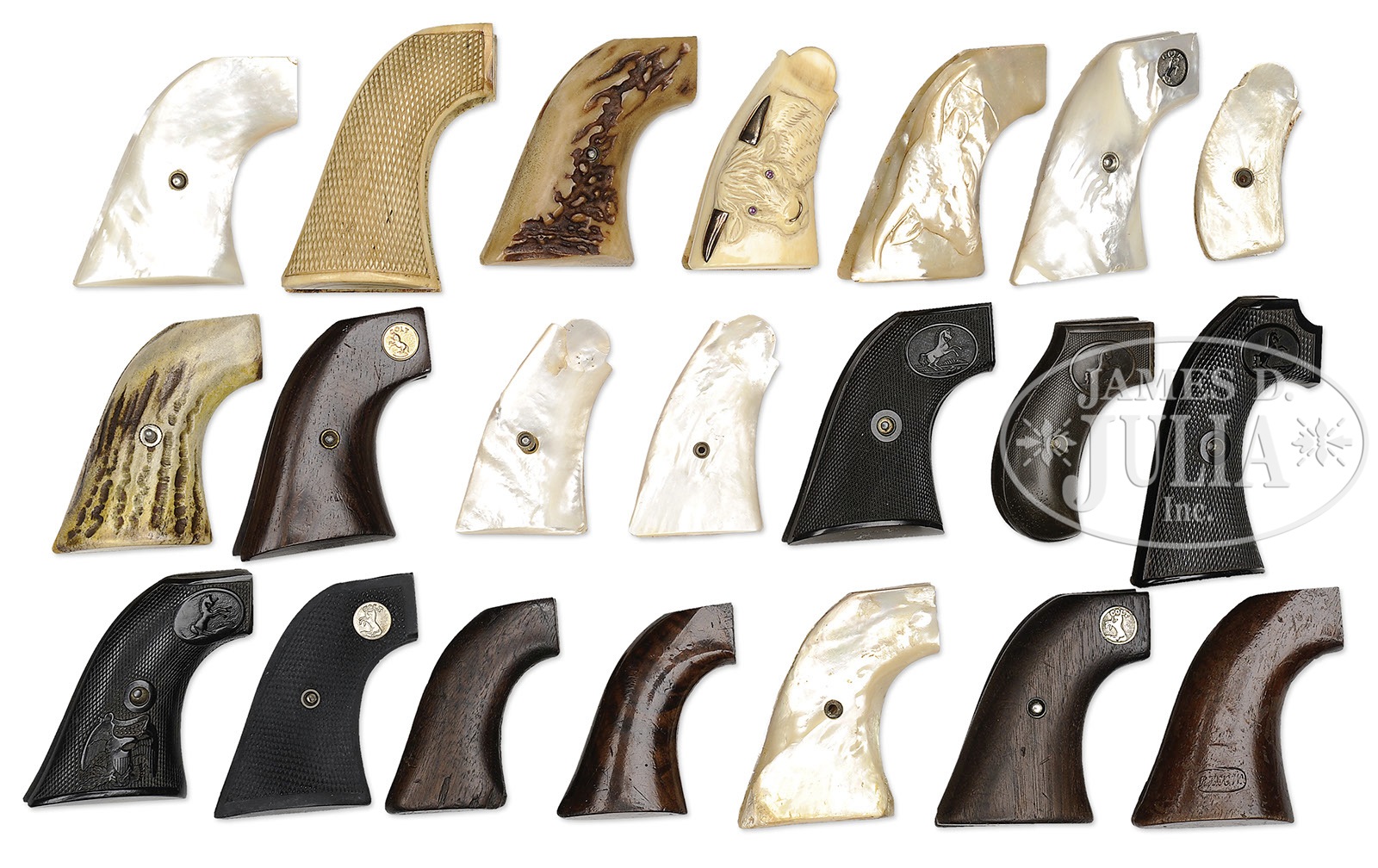 Small cabinet contains numerous cyl bushings, base pins, hammer springs, antique & modern hammers, ejector springs, ejector rods (one with bullseye ejector rod head), ejector housings (one 1st type), one trigger guard serial number “89005”, numerous hands & springs, lockbolts, trigger/lockbolt springs, triggers, firing pins and a large variety of miscellaneous screws mostly for Single Action revolvers. A small plastic bag contains other Colt parts, mostly springs, including a 1st/2nd dragoon V-hammer spring and a dragoon sized wedge. Also included are eight orig Colt Single Action Army barrels, three are 5-1/2″ (two 44 Special and one 45 Colt), one 5-1/2″ 32 WCF, one 4-3/4″ Frontier Six Shooter roll marked, one late 5-1/2″ 45 Colt, one 4-3/4″ 38 WCF orig nickel and one 7-1/2″ 44 S&W target bbl with ejector housing attached. In addition there are 5-sgl action cyl: 1) 357 with star on front-very fine. 2) 357 with “RAMPANT COLT” on rear face and “086 W” on front – fine. 3) A blued 44 special – fine. 4) Blued 44 Russian – fine. 5) Nickel 38/40 – fair. Bag of parts for a Colt Model 1877 Thunderer, appears to be complete except for frame and bbl – fair. Additionally, Four sets orig 2-pc pearl grips, one with awesome raised carved ox head and another with deep Colt medallions; one set old Single Action stag grips; one set old silver medallion smooth walnut grips; four sets Bisley Rampant Colt hard rubber grips; one 1-pc checkered ivory grip for 1860 Army; two 1-pc walnut grips 49 pocket or Baby Dragoon (one very fancy); one 1-pc military walnut grip with clear cartouches and four digits of serial number “0586” in backstrap channel; ten full sets pre-war Rampant Colt hard rubber grips; one set pre-war Rampant Colt/eagle hard rubber grips and a right hand Rampant Colt hard rubber grip; lot of fourteen reproduction and post-war Single Action grips & three sets 1878 Rampant Colt hard rubber grips; five sets late pre-war or early post-war Rampant Colt hard rubber grips; nine sets miscellaneous Colt and other grips, five of which are pearl, one set Remington derringer hard rubber grips, one set small rosewood grips possibly for a ladysmith, a set of Rampant Colt Model 1877 hard rubber grips, a rosewood left grip for Remington Single Shot derringer and a spectacular set of Wolf & Klar double action ivory grips with raised carved ox head that has gold horns, a gold ring in its nose and red stone eyes set in gold bezels; nine sets Colt Automatic pistol grips including: two sets black plastic 2nd Model Woodsman, one set Coltwood 3rd Model Woodsman, one set brown plastic pre-war match target woodsman, one set 2nd issue full checkered walnut woodsman, one set gold medallion smooth ivory 1911 grips, two sets full checkered gold medallion Gov’t Model walnut grips. PROVENANCE: Tommy Rholes Estate Collection. CONDITION: Parts are generally fine. Bbls are mostly new. Nickel plated bbl is new. Target bbl retains about 85% orig blue. Grips generally very fine to extremely fine. 4-50791 JR481 (6,000-9,000) – Lot 1324