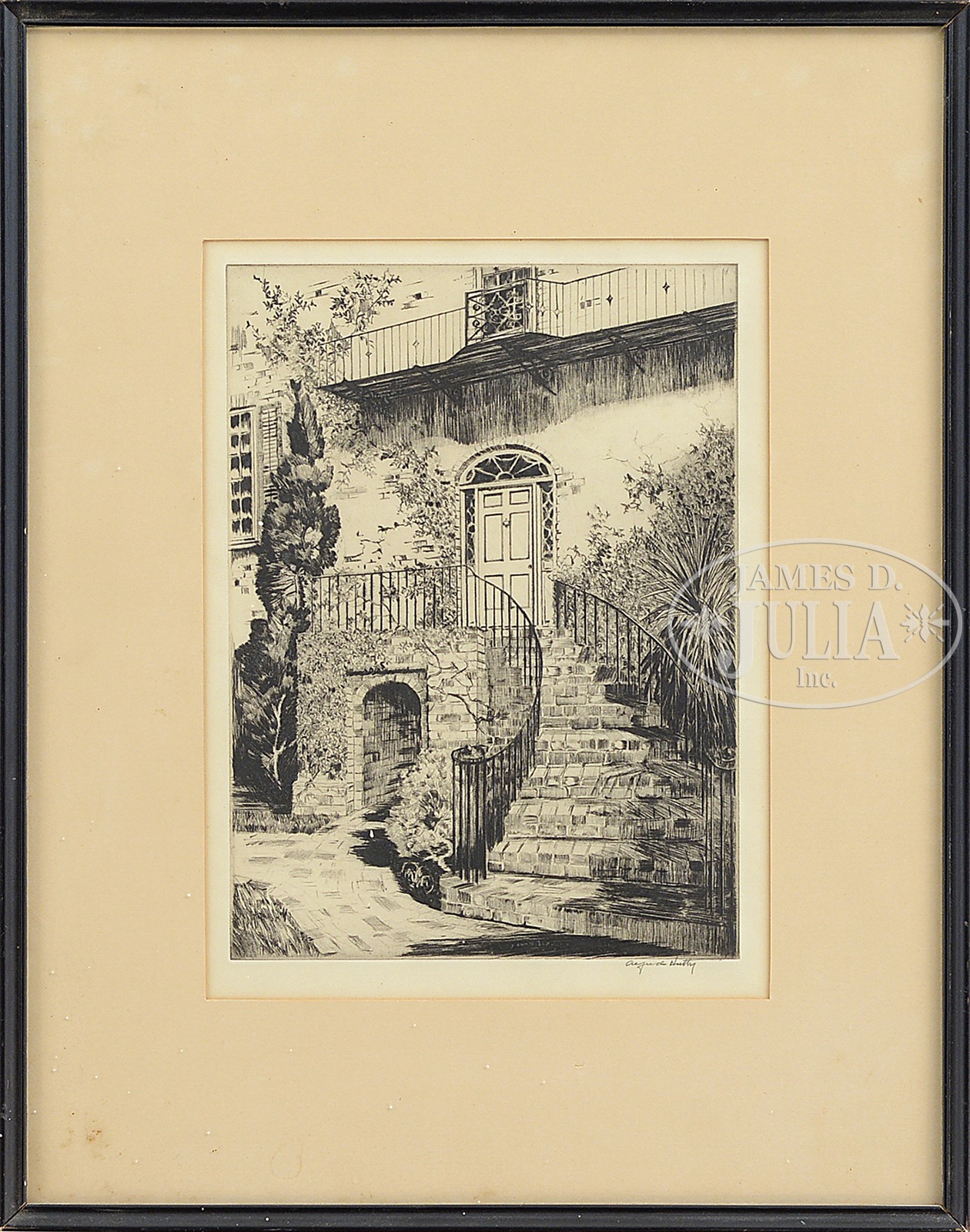 ALFRED HUTTY (American, 1877-1954) “MY DOORWAY ON TRADD STREET”.Drypoint Housed in a black wood frame, matted under glass Signed lower right “Alfred Hutty” SIZE: Plate 10-1/4″ x 7-1/2″. Overall 18-1/2″ x 14-1/2″ CONDITION: Original frame of non-archival materials, discoloration in margins, mat burn visible along edges, not examined out of frame 51348-23 (800-1,000) – Lot 1324