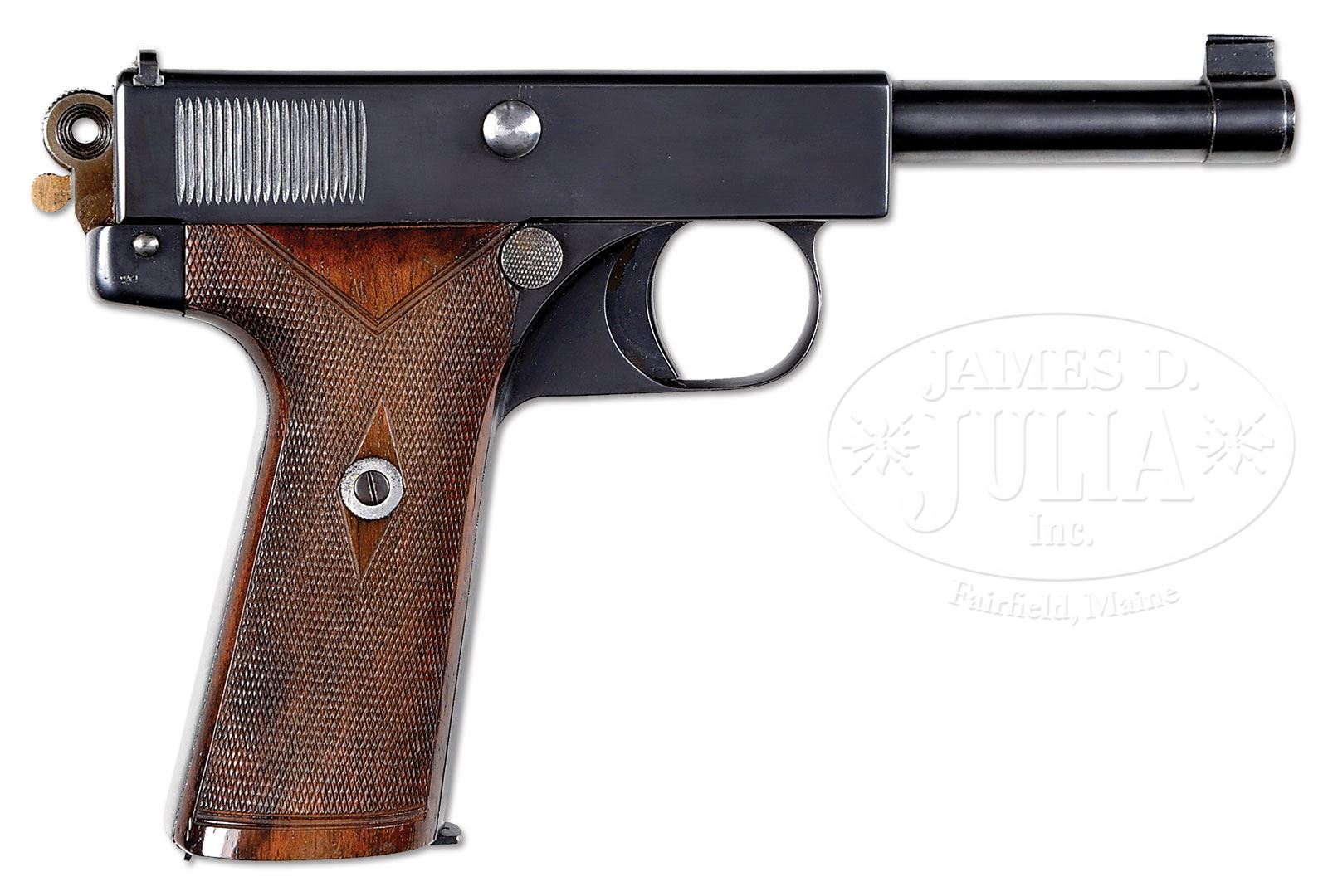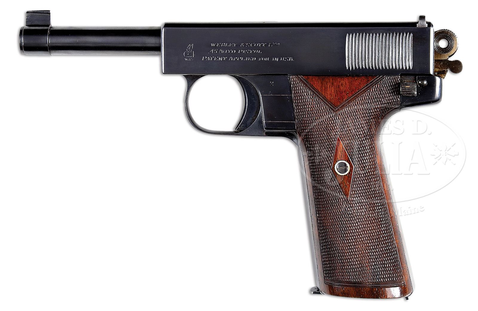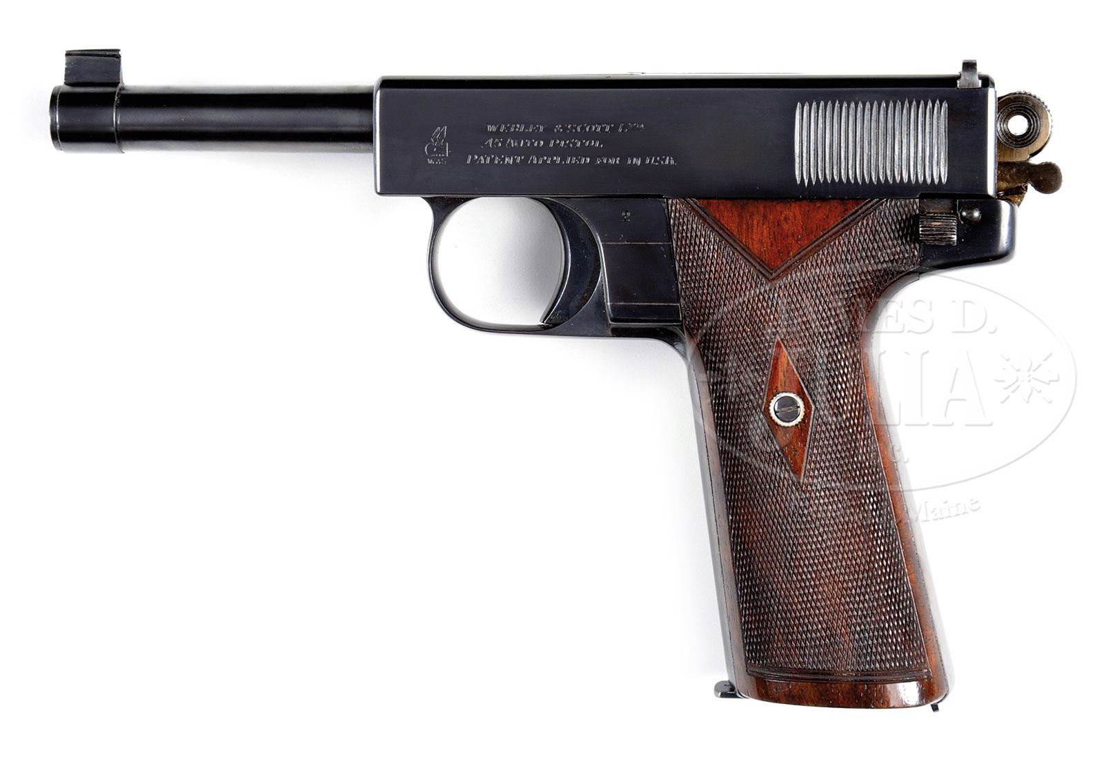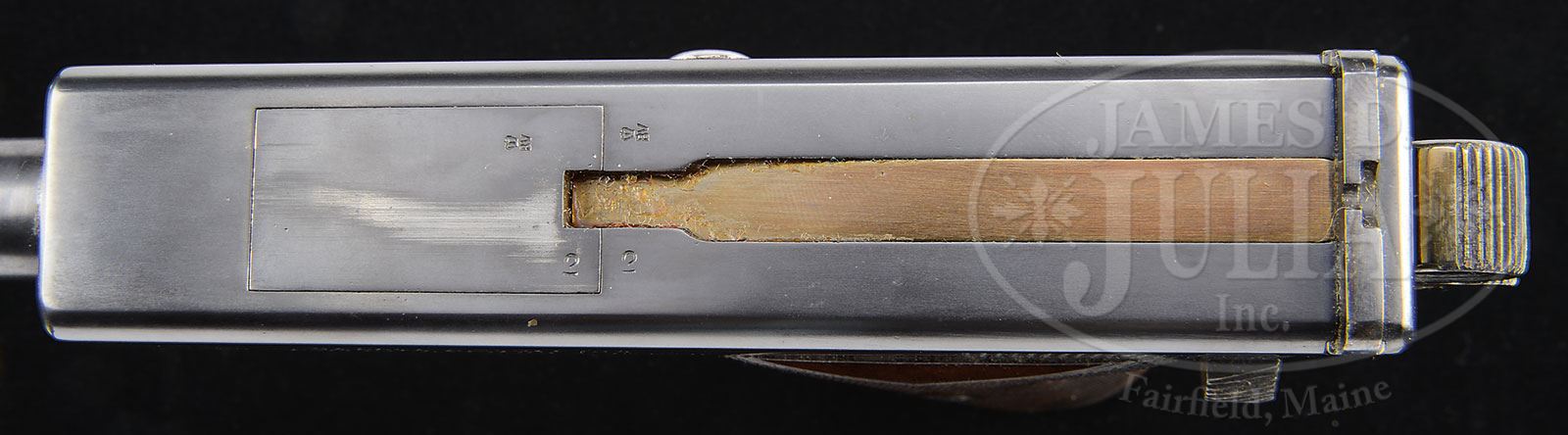 Please note: The detail images of the side of the barrel and top view of barrel and frame are not for this gun. They belong to Lot 1326. Estimate should be $35,000-$50,000. *◊ EXTRAORDINARILY RARE WEBLEY & SCOTT M1906 PROTOTYPE, U.S. TEST TRIALS, .45 M1906 TRIALS CALIBRE.SN 2. Cal. .45 M1906. Webley & Scott made a handful of M1906 prototypes in .45 M1906 calibre (the 1906/7 US trials cartridge, 1 mm longer than the production .45 ACP M1911 case) with the intent of entering them into the 1907 US test trial competition. Though the guns were never evaluated by the US Ordnance Board, they remain as some of Webley & Scott’s most interesting large caliber pistols. This example with a 5-1/16″ bbl has a fixed front sight with a bead profile and a drift adjustable rear sight that also serves to anchor the strawed top mounted extractor. The barrel block engages with the frame via three pairs of angled cam slideways (to lift/lower the block to lock/unlock the slide) in comparison to the two pairs of cams used for the production M1912 pistols. Left side of the slide is marked with the winged bullet logo ahead of a 3-line hand inscribed address “WEBLEY & SCOTT LTD / .45 AUTO PISTOL / PATENT APPLIED FOR IN U.S.A.”. SN and BV proofing appear on top of bbl, top of slide, with SN “2” marked on left side of frame. The slide is disengaged for stripping from the leaf mainspring and lever under the right grip by totally removing the stripping button on the right side of the slide. Since the button is easily misplaced, this was replaced by the captive U shaped stripping bar in the M1912 pistol. Disassembly shows all matching parts with slide internally marked under firing pin housing and bbl marked with additional “2” under the lugged reinforcement. All major parts are blued with the hammer & safety strawed. Magazine body is in the white and numbered “3” near bottom of the front spine and adjacent floorplate that is pinned in place. High quality varnished wood grips with prominent diamonds around the screw escutcheons and fine checkering. PROVENANCE: Collection of Dr. Geoffrey Sturgess. CONDITION: Fantastic restoration with perfect surface planes, sharp logo, legend and numerations. Now with better than 99% coverage with flawless front & backstraps. Same immaculate condition with respect to strawed parts. Magazine body with minor staining, near new floorplate. Beautiful grips show only a few superficial dings; no cracks or chips. Bright bore with sharp rifling and only minimal frosting. Perfect manual mechanics. One of the rarest Webleys in existence. According to the consignor, one of only two known examples. A fantastic addition to any collection. 4-52472 LMA100 (30,000-50,000) – Lot 1325