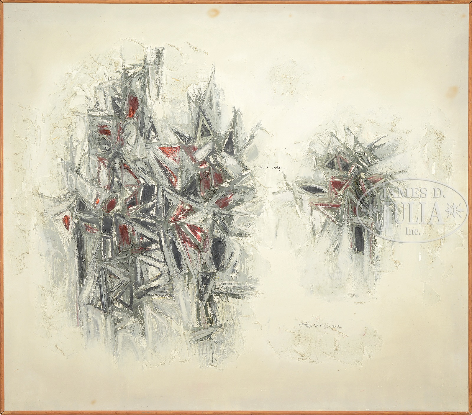 Please Note: Condition Should Read: Very good with some paint chips & loss. GULAM RASOON SANTOSH (India, 1929-1997) “BOND”.Oil on canvas Housed in a simple molded wood frame Signed lower right “Santosh” Partial typed label on verso and also title with artist & date of “62” on verso of canvas SIZE: 36″ x 41-1/4″. Overall: 36-1/2″ x 41-1/2″ CONDITION: Very good 50806-2 (20,000-30,000) – Lot 1326