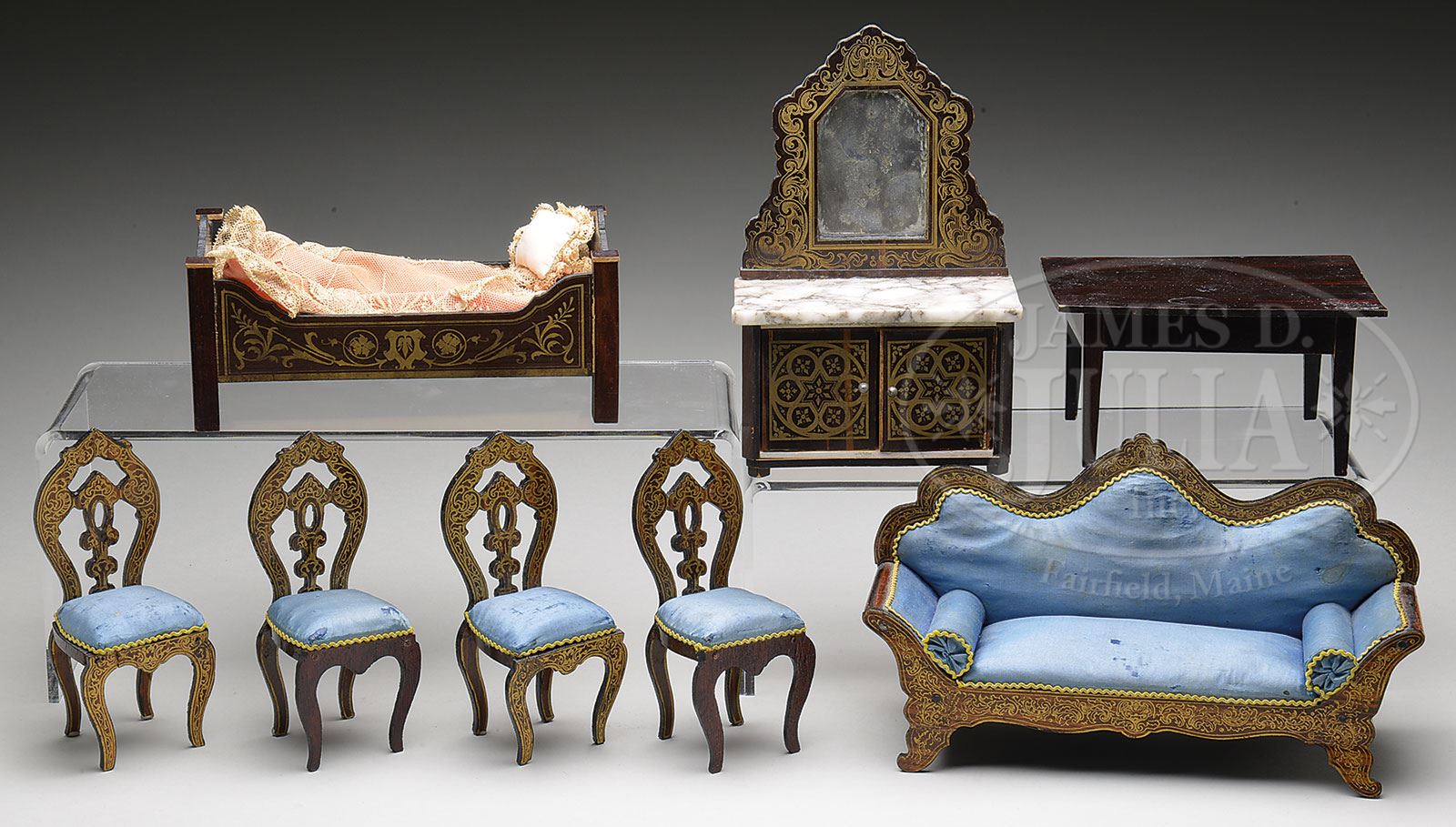 A nice grouping of slightly larger scale Biedermeier furniture including four chairs and a matching couch, all with original upholstery. Couch has had repair to all four feet. Two of the chairs have replaced front legs. A nice bed with matching bedding. A mirrored sideboard with marble top. And a simple table. SIZE: Varies from 5-1/4″ h to 7-1/2″ h. CONDITION: As stated above. 1-14884 (600-900) – Lot 1328