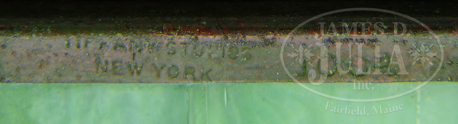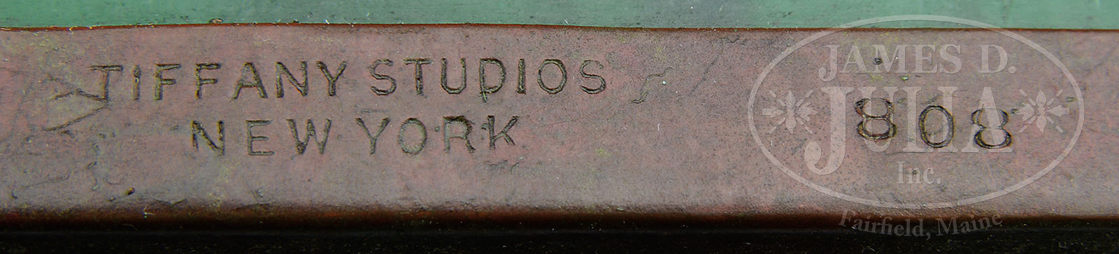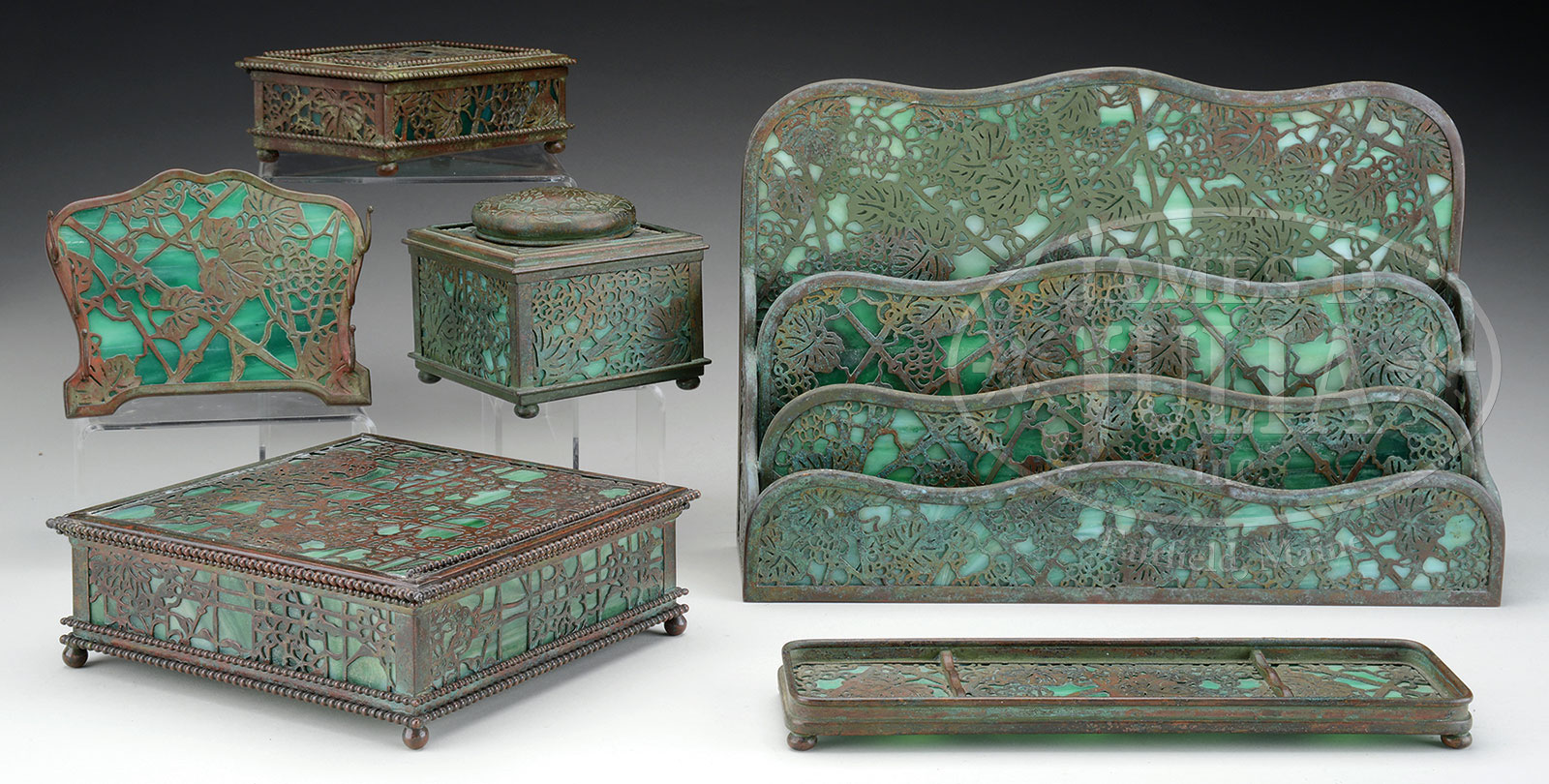 SIX TIFFANY STUDIOS GRAPEVINE DESK ACCESSORIES.Lot consists of six Tiffany Studios Grapevine desk accessories including a large letter rack, upright pen holder, square ink well, pen tray, large square box and cigarette box. Each piece is finished in a dark brown patina with subtle red highlights and the pattern is backed by green slag glass. Each piece is signed “Tiffany Studios New York” and numbered. SIZE: Letter rack: 12-1/2″ w x 8-1/2″ t. Ink well: 4″ s. PROVENANCE: From the Unreserved Estate of Lynda Cunningham. CONDITION: Condition overall very good. Letter rack has one panel with tight hairline. Letter rack, cigarette box and ink well have some light corrosion to patina. Large square box is missing beaded trim on three sides of lid. 51361-8 (1,500-2,500) – Lot 1328