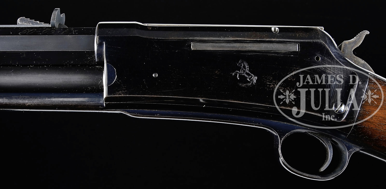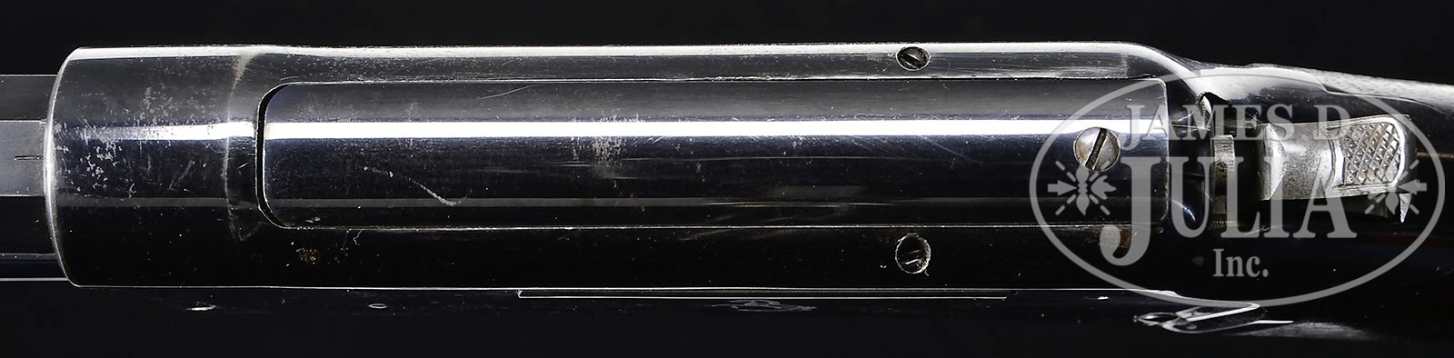 SN 1581. Cal. 50-95 EX. Standard grade rifle with 26″ oct bbl, full magazine, German silver Rocky Mountain front sight, Colt semi-buckhorn rear sight and a Lyman combination tang sight. Left side of receiver has the Rampant Colt logo roll marking and is made without manual safety, relying on the safety notch of the hammer. Mounted with uncheckered straight grain American walnut with 2-pc checkered, double schnable forearm and straight stock with crescent buttplate. Front face of the buttstock & inside the buttplate are marked with the matching serial number to this rifle. The large frame lightning rifles and carbines were produced to compete with the Winchester & Marlin big bore rifles of that era. There were only 6,496 of these big rifles produced during the period 1887 to 1894, in a variety of calibers, and only a few in 50 Ex. While Colts advertizing and distribution systems were certainly the equivalent of Winchester and probably superior to Marlin, the dramatic departure from the already established lever action style did not reach acceptable sales with the American public and production ceased. The lightning rifles were strong and reliable and probably faster acting than their lever action brethren but were simply not adopted by the buying public. PROVENANCE: Tommy Rholes Estate Collection. CONDITION: Very fine to extremely fine. Bbl & magazine tube retain 98-99% strong orig blue with only very faint sharp edge wear and some minor dulling on the magazine tube. Receiver retains 92-94% glossy orig blue with some fine flaking and one small cleaned area on the side and another on the bottom. Bottom tang is mostly a blue/grey patina; hammer retains brilliant case colors; buttplate retains 70-75% orig blue. Wood is sound with only a very few fine nicks and a small chip by the top tang at the receiver and overall retains virtually all of its orig finish. Mechanics are crisp. Brilliant shiny bore, possibly unfired. 4-50627 JR37 (20,000-30,000) – Lot 1329