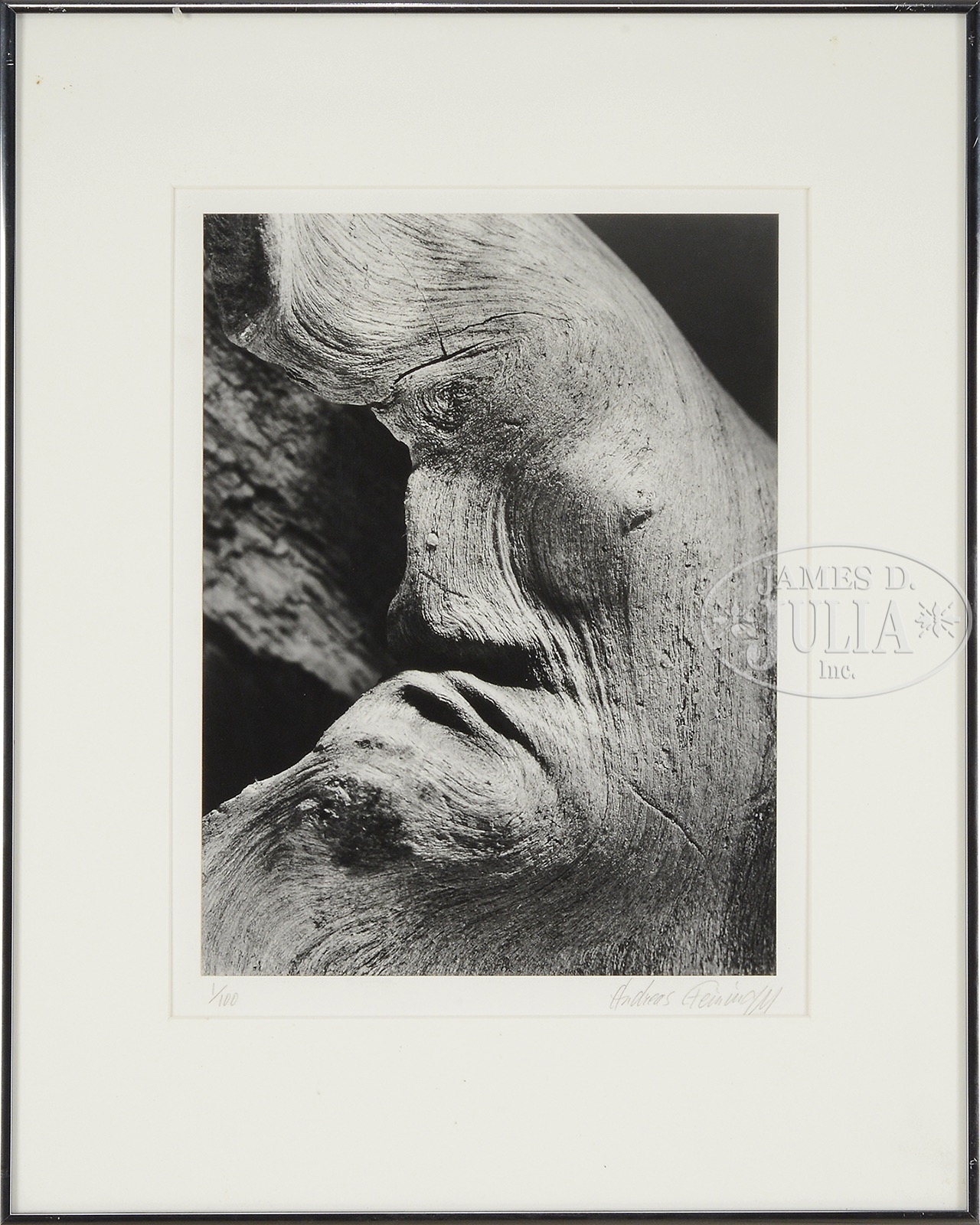 ANDREAS FEININGER (American, 1906-1999) THREE PHOTOGRAPHS OF TREE BARK.Gelatin silver prints, Signed lower right “Andreas Feininger” and numbered lower left “1/100″. 1) Driftwood, Housed in a metal frame, matted under glass. 2) Untitled Tree with Foliage, Housed in a wood frame, matted under glass. 3) Untitled Tree with Bark, Housed in a wood frame, matted under glass SIZE: 1) 12-1/4″ x 9-1/4″. Overall 20-1/4″ x 16-1/4″. 2) 9-1/4″ x 9-1/4″. Overall 17-3/4″ x 14-3/4″. 3) 12-1/4″ x 9-1/4”. Overall 17-3/4″ x 14-3/4″ CONDITION: All very good 51205-6 (800-1,200) – Lot 1329