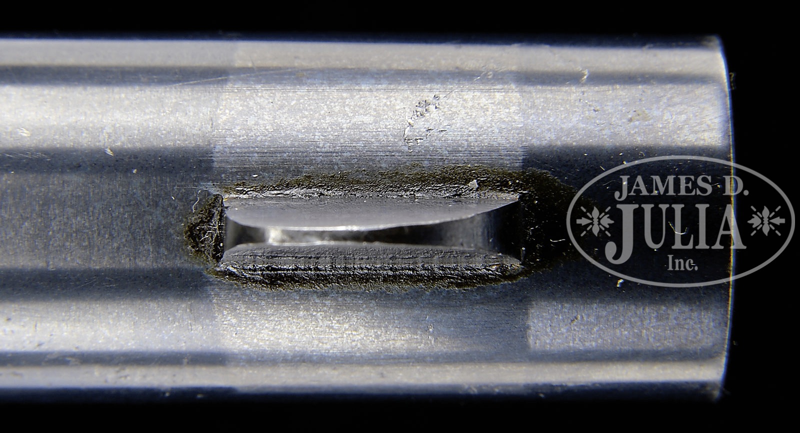SCARCE VERY HIGH CONDITION HENRY NETTLETON INSPECTED COLT CAVALRY SINGLE ACTION ARMY REVOLVER.SN 48860. Cal. 45 Colt. Blue & color case hardened with 7-1/2″ bbl, full front sight and 1-line block letter address. Left side of frame has 3-line patent dates and a small “U.S”. Mounted with a 1-pc walnut grip that has last four digits of matching serial number in backstrap channel. Left side of grip has a crisp “JEG” (Capt. John E. Greer) inspector cartouche under the date 1878. Right side has the crisp “HN” Henry Nettleton sub-inspector cartouche. Various parts have Mr. Nettleton’s initials, H.N., including bbl, cyl, frame, trigger guard, top of backstrap, bottom right edge of grip and left side of hammer. Bottom of bbl, under ejector housing, has last four digits of matching serial number which are also found on outside diameter of cyl. Trigger guard has the serial number “48960”, factory assemblers stamping error. Ejector housing is 2nd type with bulls-eye ejector rod head and base pin is orig type with dimpled ends. This revolver was produced between May and August 1878 and almost certainly would have been issued to a front line Cavalry unit fighting Indians in the west. The fact that it retains virtually all of its crisp orig finish in orig configuration lends credence to the thought that it may have been issued to a high ranking officer who never used it or possibly went to a state militia unit. Obviously it escaped the recalls of the 1890s and early 1900s where several thousand Cavalry revolvers were returned to Colt or Springfield Arsenal and modified to artillery configuration by having their bbls cut to 5-1/2″. CONDITION: Exceptionally fine (probably unfired) all matching including bbl, cyl & grip, except trigger guard as noted. Bbl retains 96-97% crisp orig blue with full strong feathers on each side of front sight and ejector housing stud showing only light muzzle edge wear and a small wear spot on left side; ejector housing retains about 90% orig blue with wear at the tip and outer radius; frame retains about 98-99% brilliant orig case colors with some thinning on the left recoil shield, a couple small scratches and very faint sharp edge wear; hammer retains virtually all of its brilliant, orig case colors turned a little dark on top edge; cyl retains 95-96% strong orig blue with sharp edge wear around the front edge, small wear spots opposite each other on the rear side, probably from sliding around in a drawer and has a light cyl line; trigger guard & front strap retain about 98% crisp orig blue; backstrap has some tiny scratches near the top with a few small streaks of candy striping and overall retains 95-96% crisp orig blue; grip has a gouge on the left side and shows light edge wear, again from sliding around in a drawer and overall retains a light hand worn patina. Hammer is not solid in half cock notch, otherwise mechanics are fine; brilliant shiny bore. Chambers of the cyl & bore retain virtually all of their orig factory blue. 4-50383 JR456 (100,000-125,000) – Lot 1330