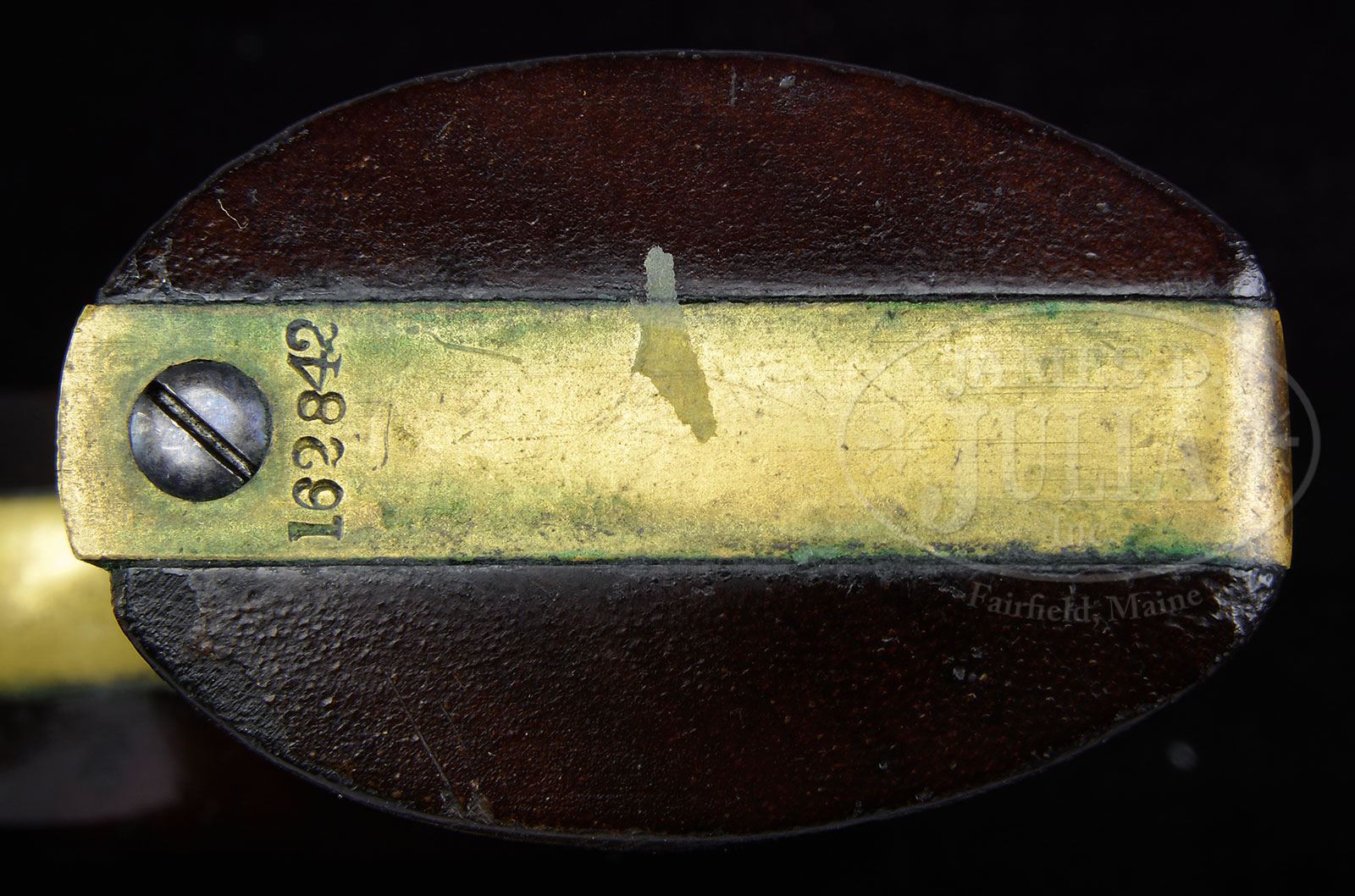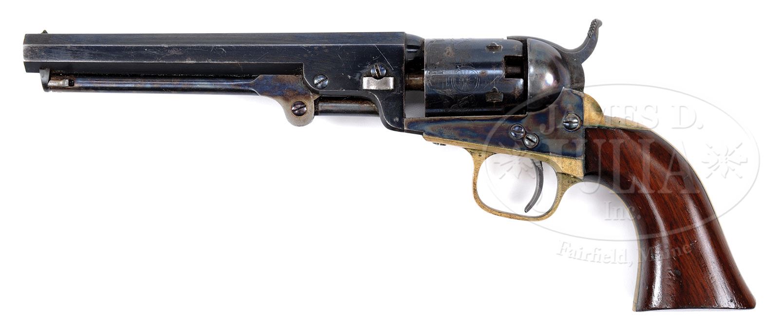EXCEPTIONAL CASED 6″ COLT MODEL 1849 PERCUSSION REVOLVER.SN 162842. Cal. 31. Blue & color case hardened with 6″ oct bbl, brass pin front sight and 2-line New York address with brackets. Left side of frame has a tiny “COLTS PATENT”. The brass trigger guard & backstrap contain a varnished 1-pc walnut grip. Cyl is 5-shot with stagecoach holdup scene roll marking. This model was one of Colt’s most popular revolvers having received immediate acceptance with the buying public upon its introduction with approx. 325,000 being produced in the period 1850-1873. This revolver was produced early in 1860. These revolvers usually served under harsh circumstances with very little maintenance and are rarely found today with high orig finish such as this example. Accompanying Colt casing is lined with a dark purple velvet retaining a fine 2-cavity brass “Colts Patent” mold and “Colt Patent Eagle Flask”. This is a most beautiful gun in almost new condition appearing unfired with unusual variation of a special ordered unplated trigger guard and backstrap that would be difficult to upgrade. PROVENANCE: Norm Flayderman Estate Collection. CONDITION: Excellent overall, all matching though not disassembled to check for additional numbers as this gun appears original and as found. Bbl and cyl retain over 95% of their glossy orig blue finish with only minor blemishes. Cyl chambers still retain about half of their org bright blue finish lending to the opinion that this gun was unfired. Case colors are bright on almost all of the frame, 60% of loading assembly and mostly muted on hammer. Trigger guard and backstrap have a fine brass patina with sharp edges and appear to have been made without plating. Grip is sound, well-fit retaining 98% plus original varnish with losses only at sharp edges. Mechanics are crisp with bright shiny bore. Mahogany casing is sound and solid still retaining much of its orig varnish. Lining once a deep purple still shows hints of its orig color though mostly faded to brown. Case is heavily soiled and stained, especially on bottom. Several loose partitions have had straight pins attached to keep them in place. Accompanying 2-cavity brass mold is very good to fine with numerous small dents and dings where apparently used as a tack hammer. Colts Patent Eagle Flask is fine retaining strong traces of orig varnish and brass patina. Colt L-shaped gun tool is very good retaining traces of orig blue. About 20 lead bullets are also found in case. 4-54422 JS18 (7,000-9,000) – Lot 1331