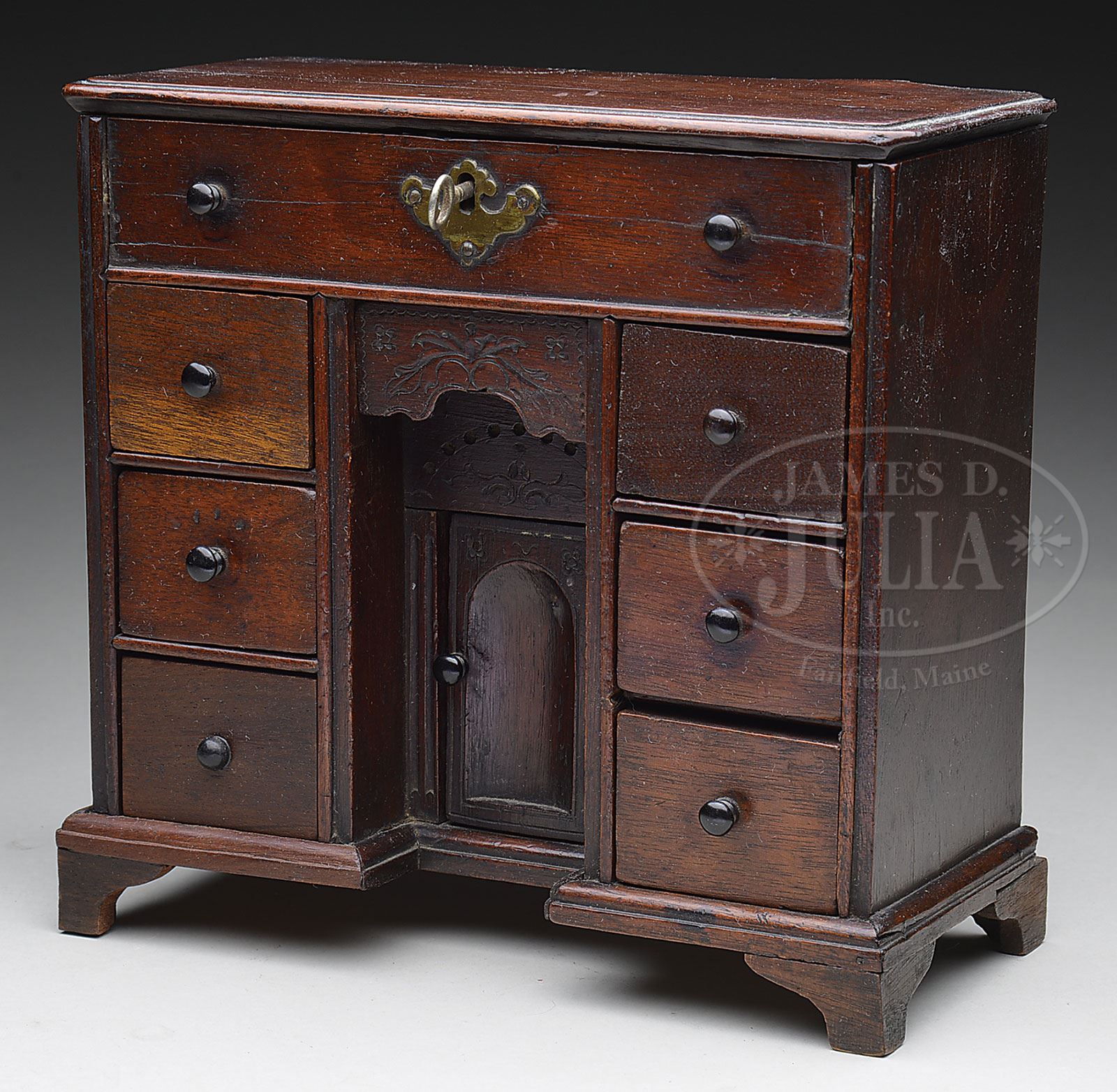 FINE EARLY GEORGIAN STYLE DOLL SIZE KNEE HOLE DESK.Most likely crafted around the latter part of the 19th century, this elaborate knee hole desk features six drawers and an opening locking top area. The most interesting aspect of this piece is the knee hole area with an opening drawer as well as a cabinet below. An excellent and charming display piece for French dolls of merit to accent their importance. SIZE: 4-1/4 ” d x 9″ h. CONDITION: Overall very good plus. Possible trim replacement on lower left side. 1-14839 (400-600) – Lot 1331 Auction: Advertising, Toy & Doll Auction - Fall 2014 Please Note: All prices include the hammer price plus the buyer’s premium, which is paid by the buyer as part of the purchase price. The prices noted here after the auction are considered unofficial and do not become official until after the 46th day. |