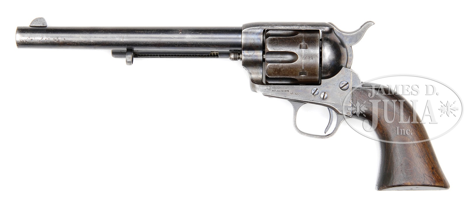 SCARCE CASEY INSPECTED COLT CAVALRY SINGLE ACTION ARMY REVOLVER.SN 16623. Cal. 45 Colt. Blue & color case hardened with 7-1/2″ bbl, full front sight and 1-line script letter address with serifs. Left side of the frame has 2-line patent dates and “U.S.”. Mounted with a 1-pc walnut grip which has last four digits of matching SN in back strap channel. Left side of the grip has partially legible “APC” (A.P. Casey) inspector cartouche. Ejector housing is first type with bull’s-eye ejector rod head and base pin is orig type with dimpled ends. Bottom right edge of the grip, bottom of the bbl, trigger guard, back strap & cyl are marked with a small “C” (also for A.P. Casey). The “C”s on bottom of bbl & cyl are of a different size font which, according to A Study of the Colt Single Action Army Revolver, Graham, Kopec & Moore, this disparity in letter size is correct in that it is believed Mr. Casey simply used two different sized stamps. Butt strap is hand-scratched with the initials “JHN”. This revolver was produced in 1875 at the height of the Indian Wars and almost certainly would have been issued to a front line cavalry unit and would have seen service on the American frontier. That it escaped the recalls of the 1890s and early 1900s attests to the theory that it was either lost in battle, stolen or assigned to a militia unit. It is known that there are several revolvers in this series which were assigned to the 7th Cavalry as replacement revolvers after the Battle of the Little Big Horn. CONDITION: Very fine. Bbl retains about 75% strong orig blue with holster wear on the left side and thinning over the top; frame retains bright case colors in the front gullets and left side, more faded on the right side and top strap; recoil shields also retain bright case colors, turned silver on the loading gate; hammer retains strong, bright case colors, turned silver on top edge; trigger guard & back strap retain blue in sheltered areas, strong on the trigger plate, faded to a blue/gray patina on the front & back straps and butt strap; cyl retains strong blue in the flutes, flaked to a medium patina on the outer diameter; chambers of the cyl and bore retain strong orig blue. Grip is sound showing moderate edge wear and retains a hand worn patina. Mechanics are fine, bright shiny bore, shows very little use. 4-51569 (10,000-15,000) – Lot 1334