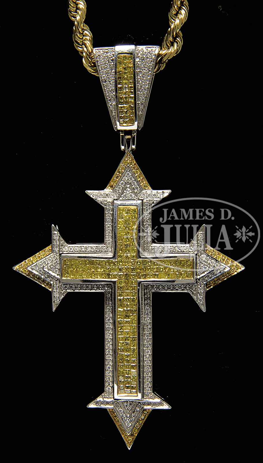 WHITE GOLD & DIAMOND CROSS NECKLACE.Large white gold pendant in the shape of a cross is comprised of 201 princess cut diamonds with 52 round brilliant cut diamonds both bright yellow in color with light green overtone accented with 224 round brilliant cut diamonds along the outer edge of the cross. The princess cut diamonds have SI2 clarity with bright yellow hue and a weight of approx 3.0ct. The 52 round brilliant cut diamonds have I1 clarity also with a bright yellow hue having a told weight of approx 0.39ct. The 224 round brilliant cut diamonds are I1 clarity with H-I color and a total weight of approx 1.12ct. The diamonds comprise the pendant as well as the bale. The pendant is suspended by a 14kt yellow gold rope chain. Necklace is accompanied by a jeweler’s appraisal. SIZE: Chain is 20″. Pendant is 4″ l including bale. CONDITION: Very good to excellent. 49056-1 (3,000-5,000) – Lot 1334
